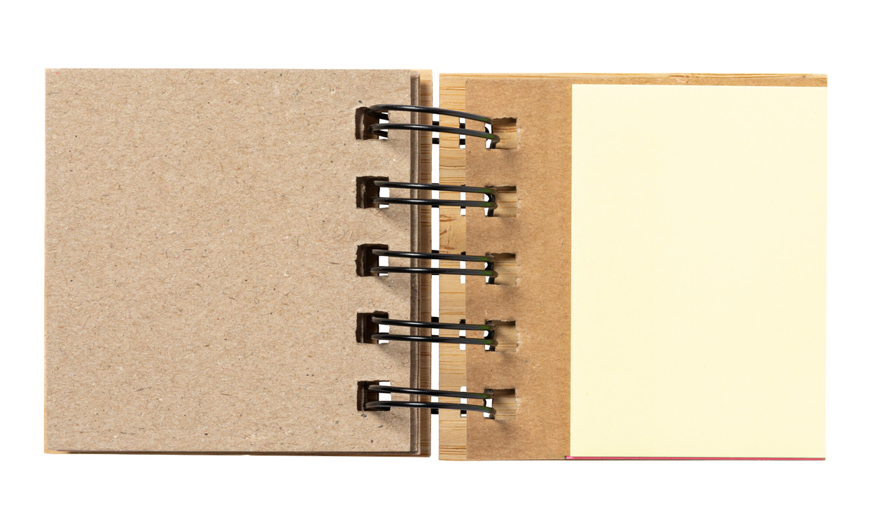 Spiralny notes z okładką bambusową z 75 dużymi karteczkami (w 3 różnych kolorach) i 125 małymi karteczkami samoprzylepnymi (w 5 różnych kolorach).