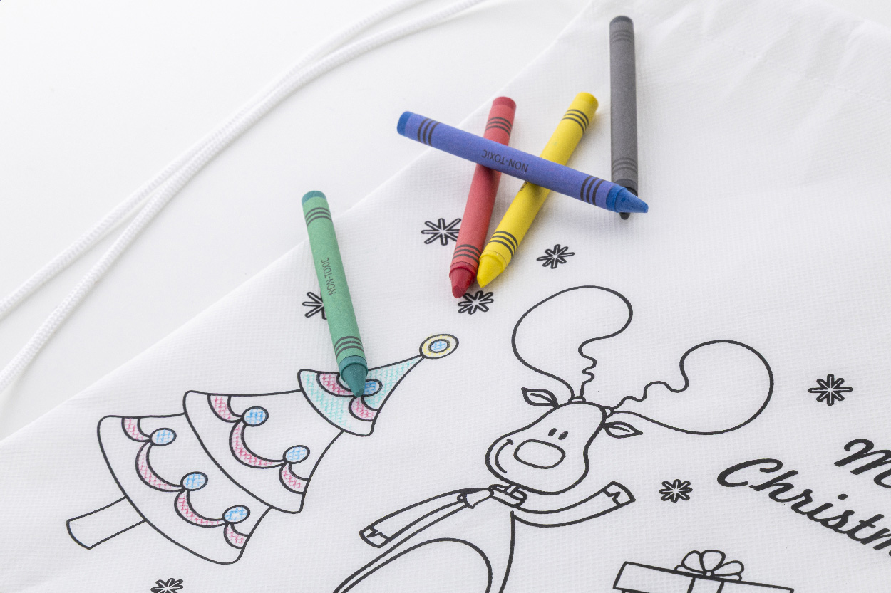 Kolorowanka świąteczna woreczek ze ściągaczem z włókniny RPET z 5 kredkami.