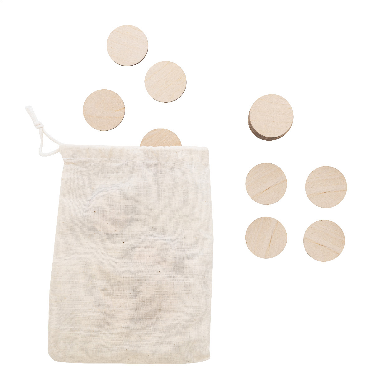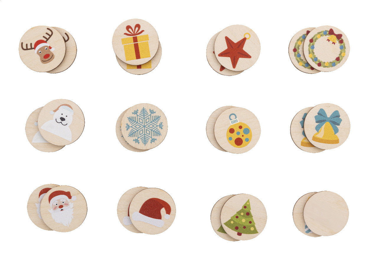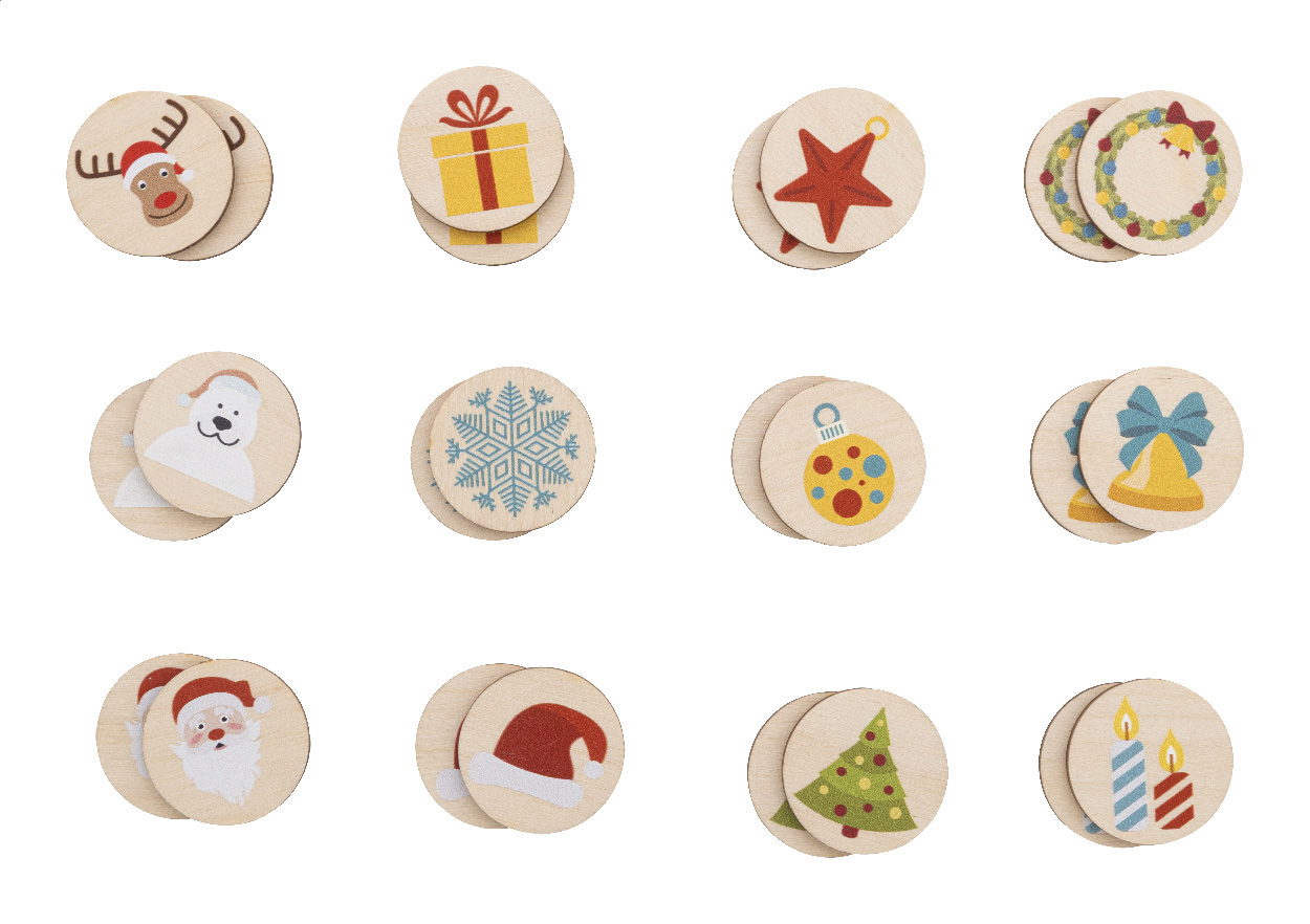 Gra memory z laminowanej sklejki brzozowej z motywami świątecznymi, w bawełnianym etui. Zawiera 24 płytki (ø35 mm).