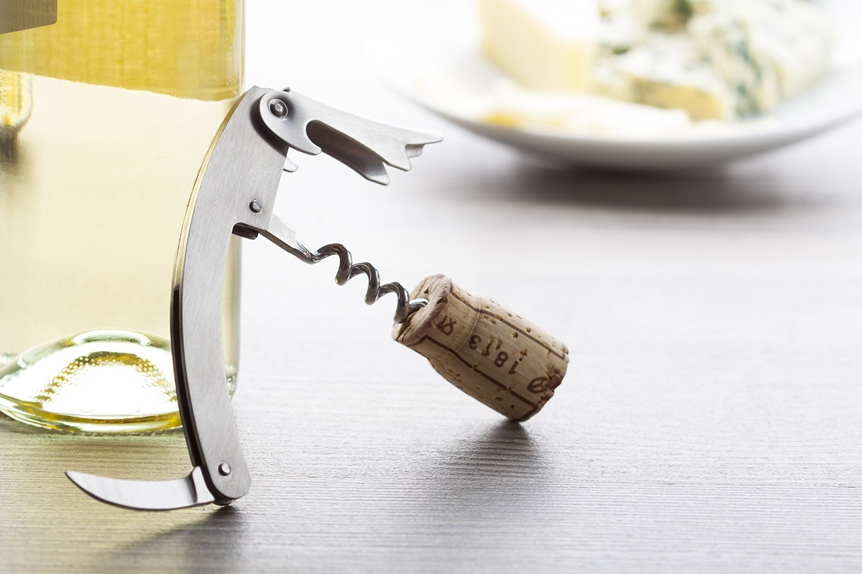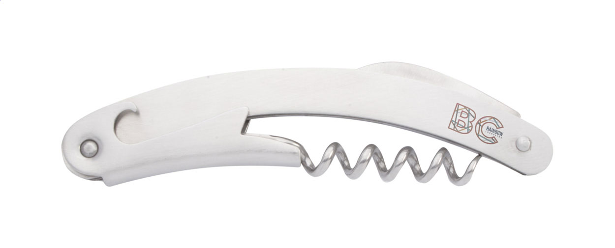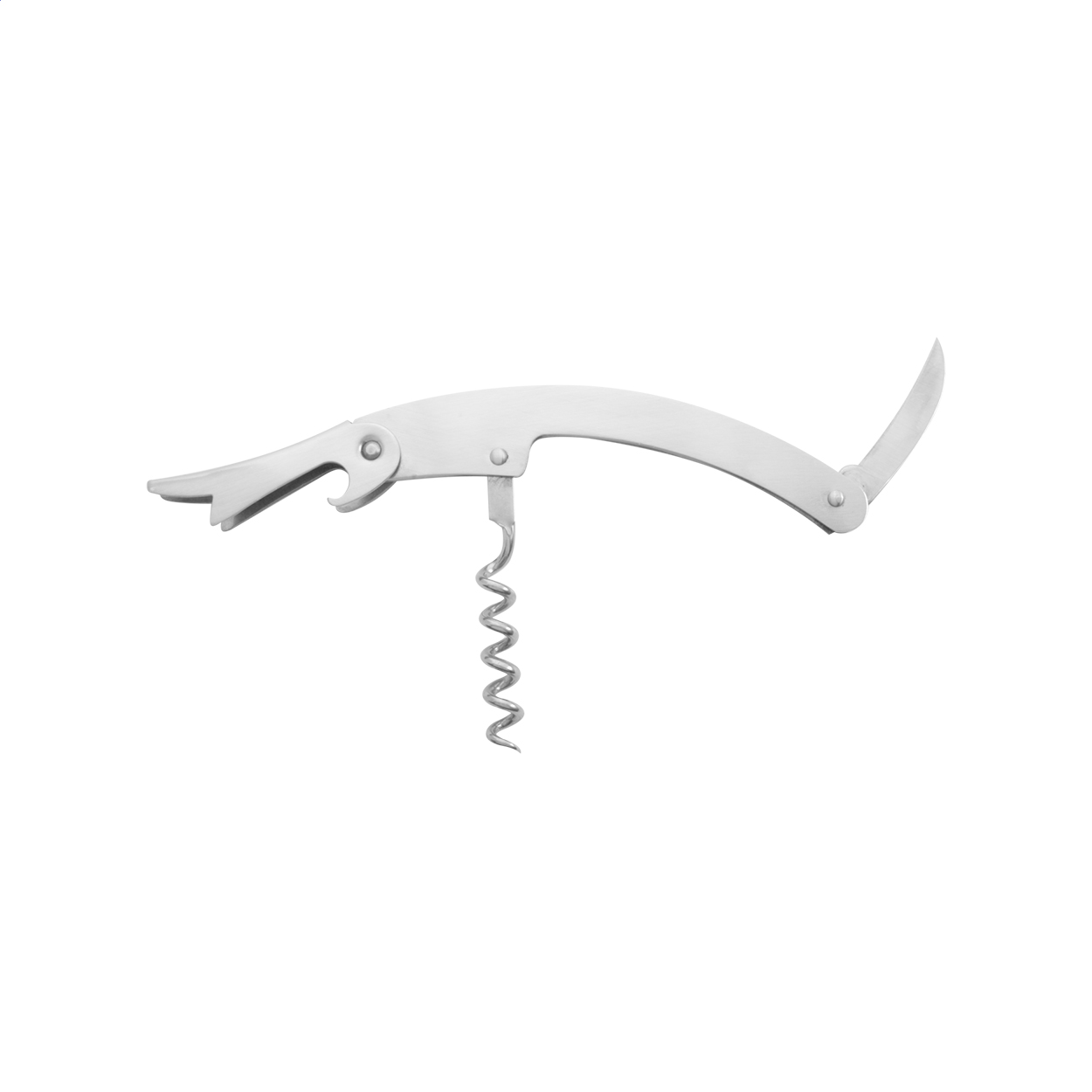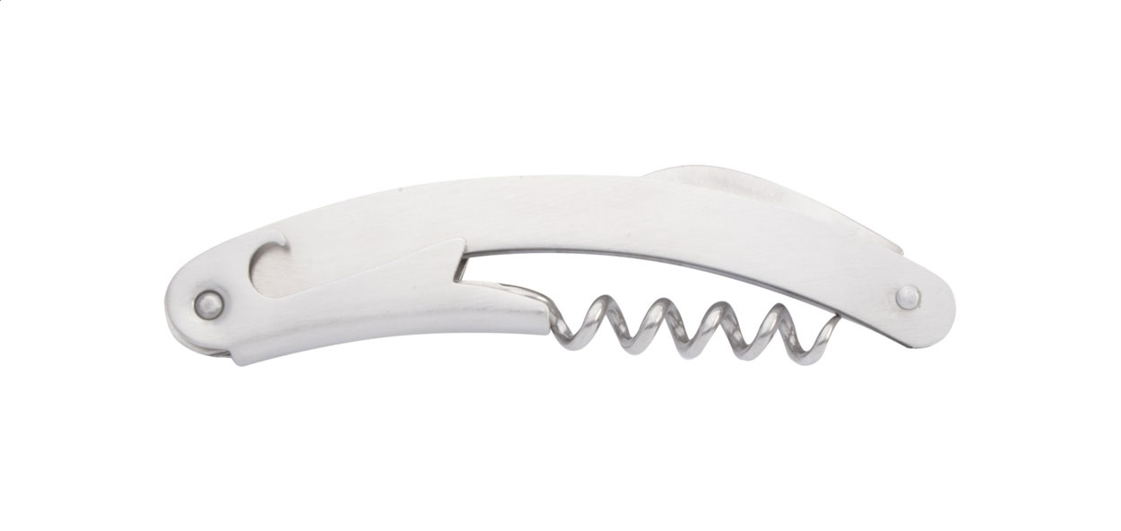 Metalowy korkociąg z otwieraczem do butelek, z małym nożem.