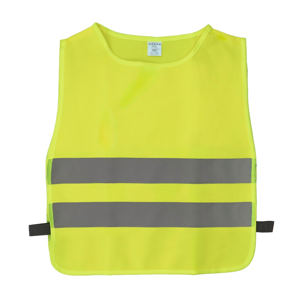 Kamizelka dziecięca odblaskowa, posiada po dwa paski odblaskowe z przodu i z tyłu, certyfikowana zgodnie z EN17353