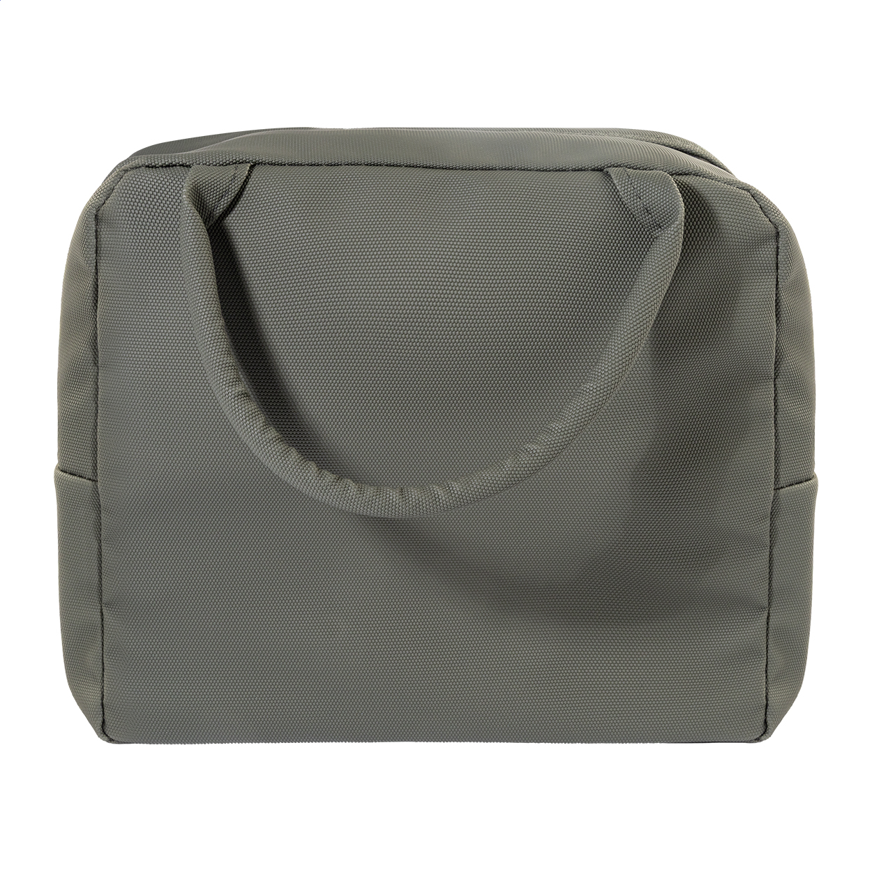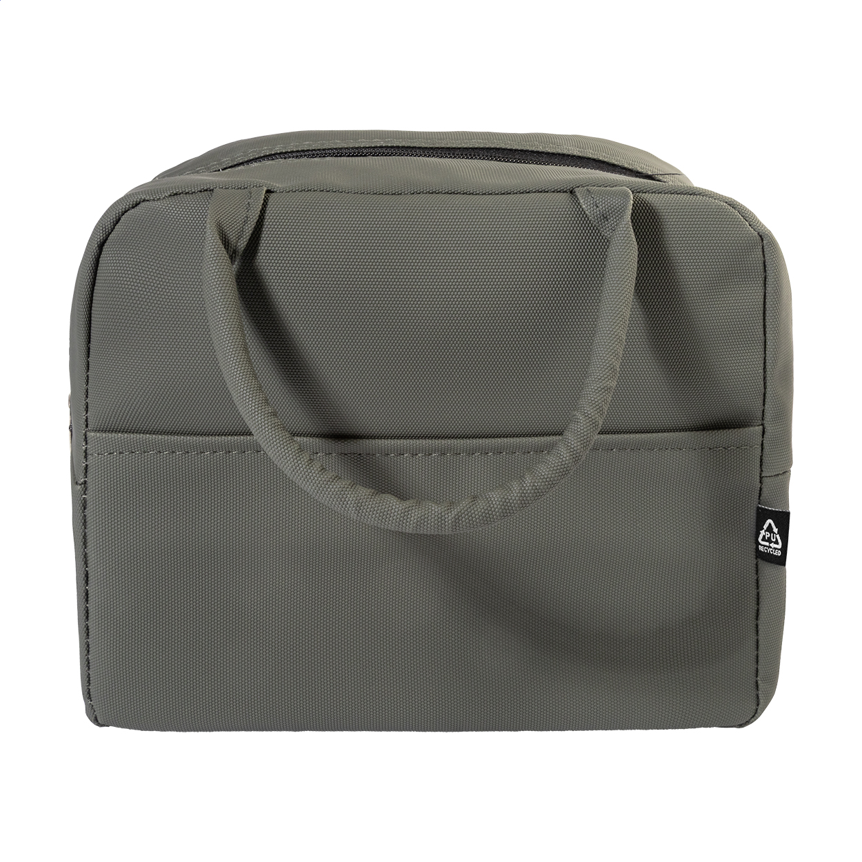 Zapinana na zamek, miękka torba termiczna z recyklingowanej skóry PU, z kieszenią z przodu i aluminiową wyściółką. Z charakterystyczną metką z recyklingowanego PU.