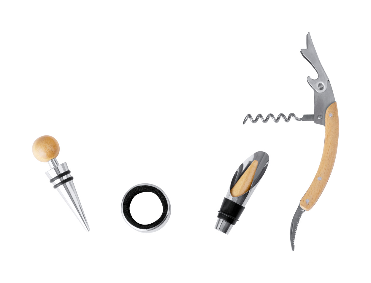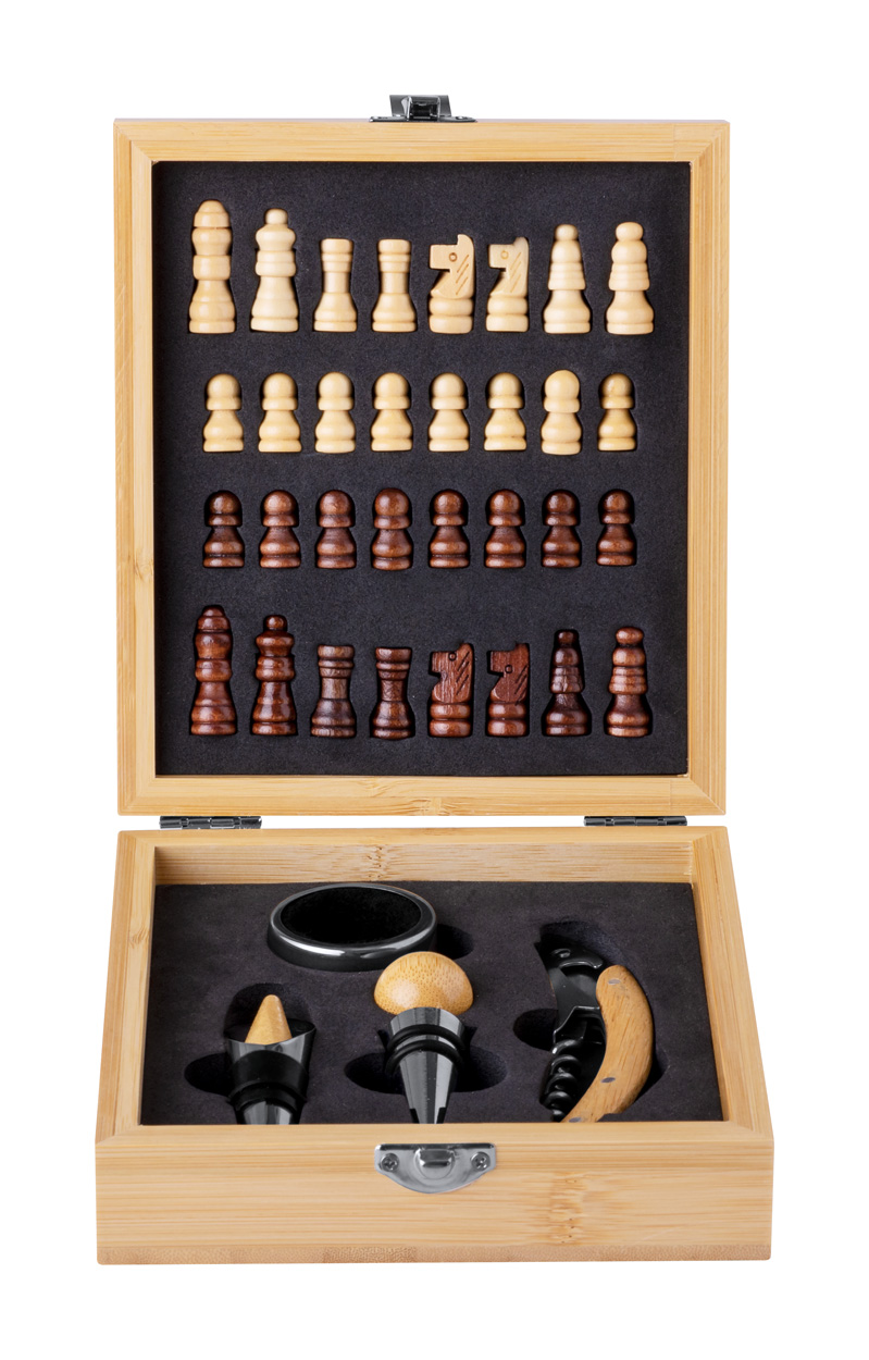 Zestaw do wina ze stali nierdzewnej, składający się z 4 części, w bambusowym pudełku, z szachownicą i 32 figurami szachowymi. Zawiera korkociąg, korek, dyszę i zatyczkę.