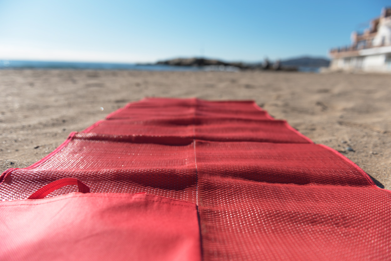 Pleciona plastikowa mata plażowa z uchwytami do przenoszenia.