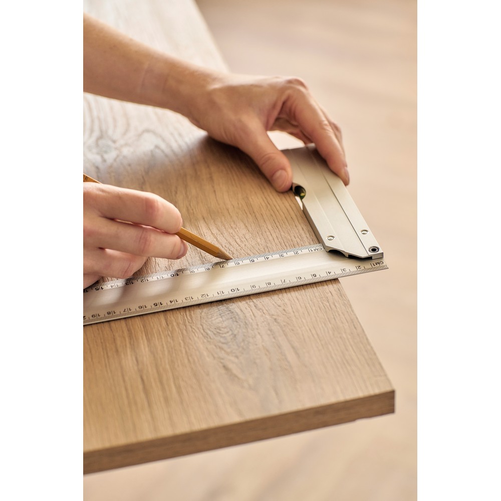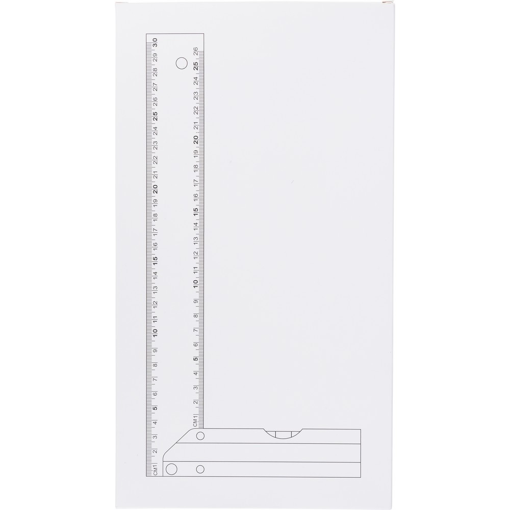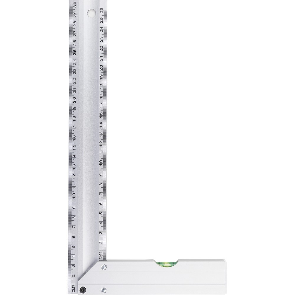 Kątownik 30 cm, poziomica, pomiar w cm, zapakowany pojedynczo w brązowy kartonik, produkt wykonany z aluminium
