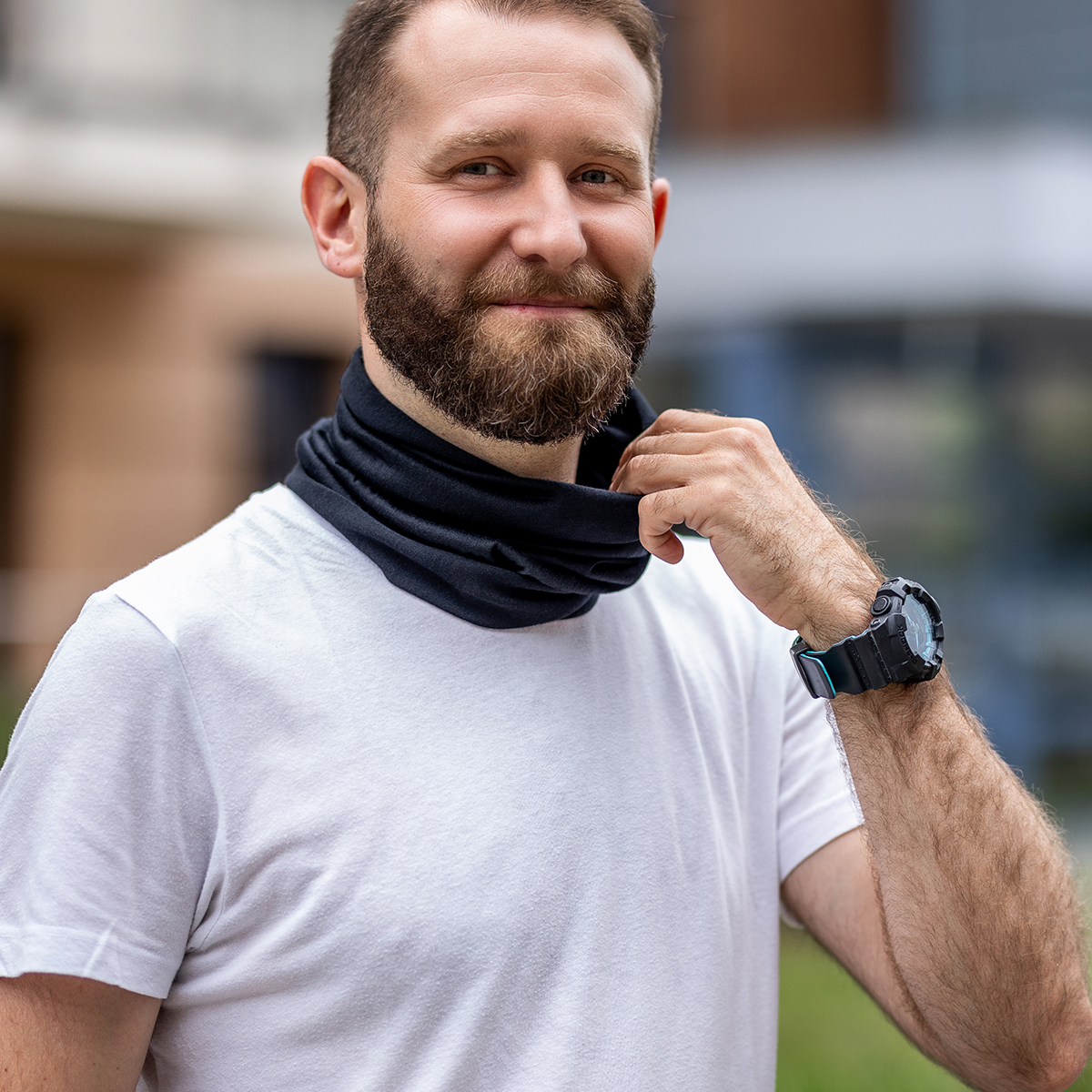 Wielofunkcyjny komin z wykonany z przyjemnej w dotyku dzianiny. Może także służyć jako osłona szyi, ust, nosa, a także jako okrycie głowy.