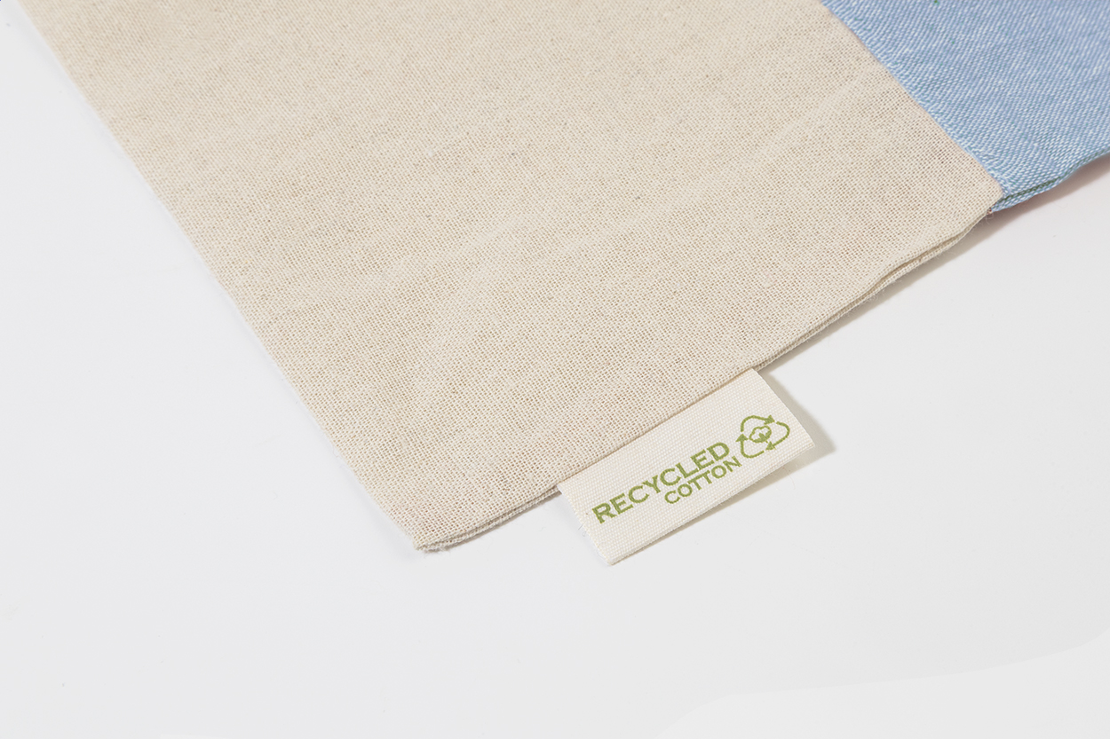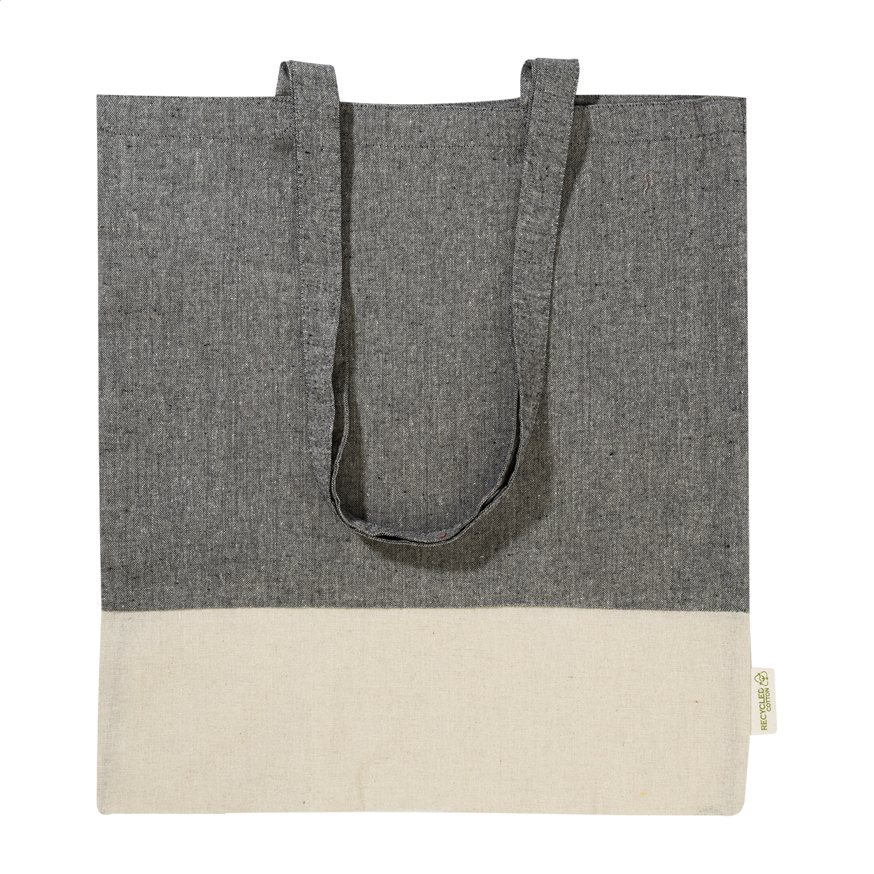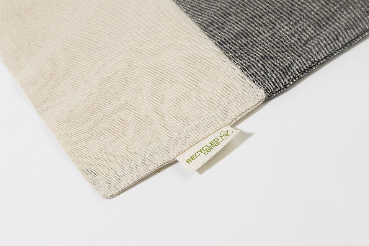 Dwukolorowa torba na zakupy z bawełny pochodzącej z recyklingu, z długimi uchwytami i charakterystyczną metką informującą o bawełnie pochodzącej z recyklingu. 100% bawełna z recyklingu, 120 g/m².