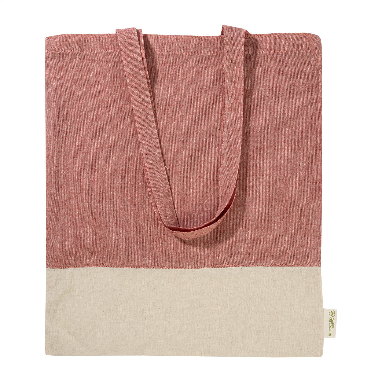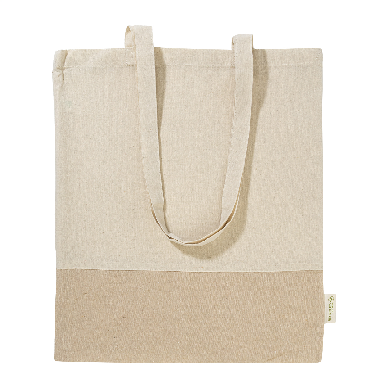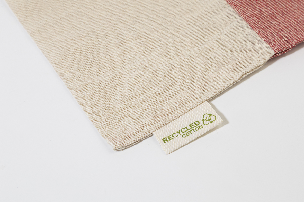 Dwukolorowa torba na zakupy z bawełny pochodzącej z recyklingu, z długimi uchwytami i charakterystyczną metką informującą o bawełnie pochodzącej z recyklingu. 100% bawełna z recyklingu, 120 g/m².
