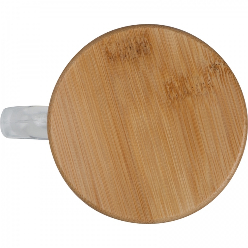 Szklanka z uchem, podwójnymi ściankami, wykonana ze szkła, o pojemności 350 ml, z bambusowym wieczkiem.