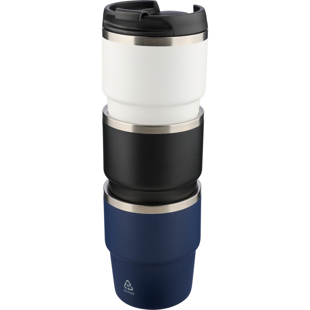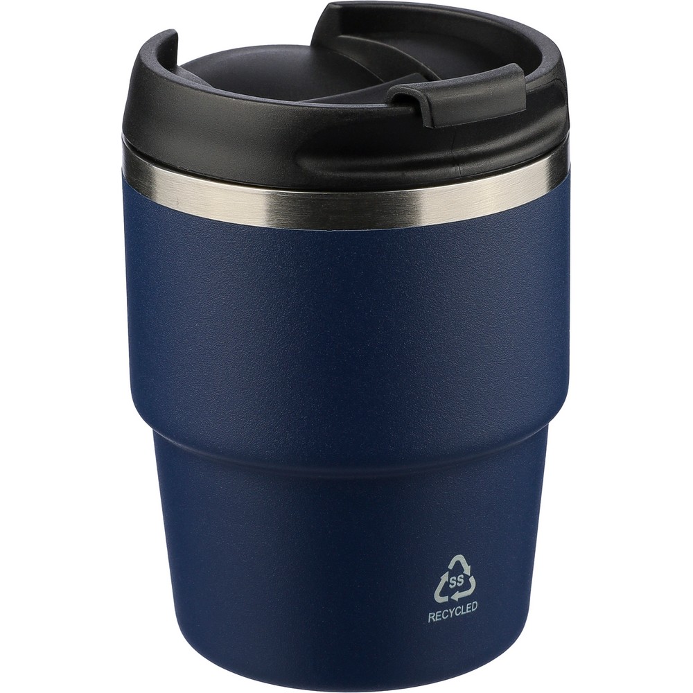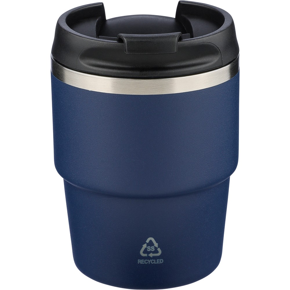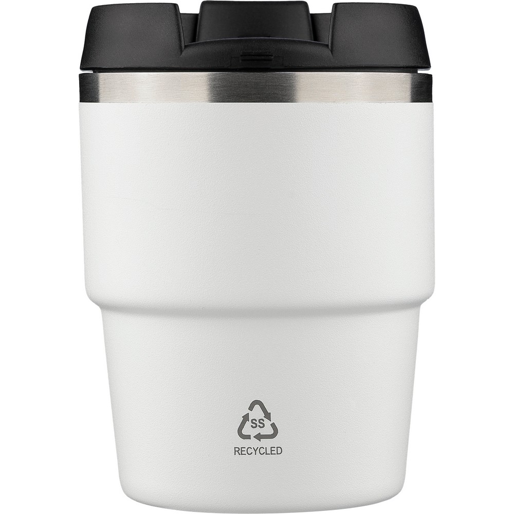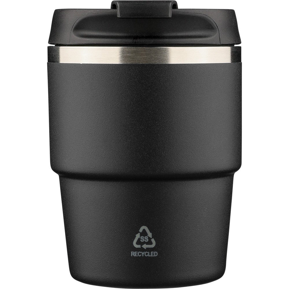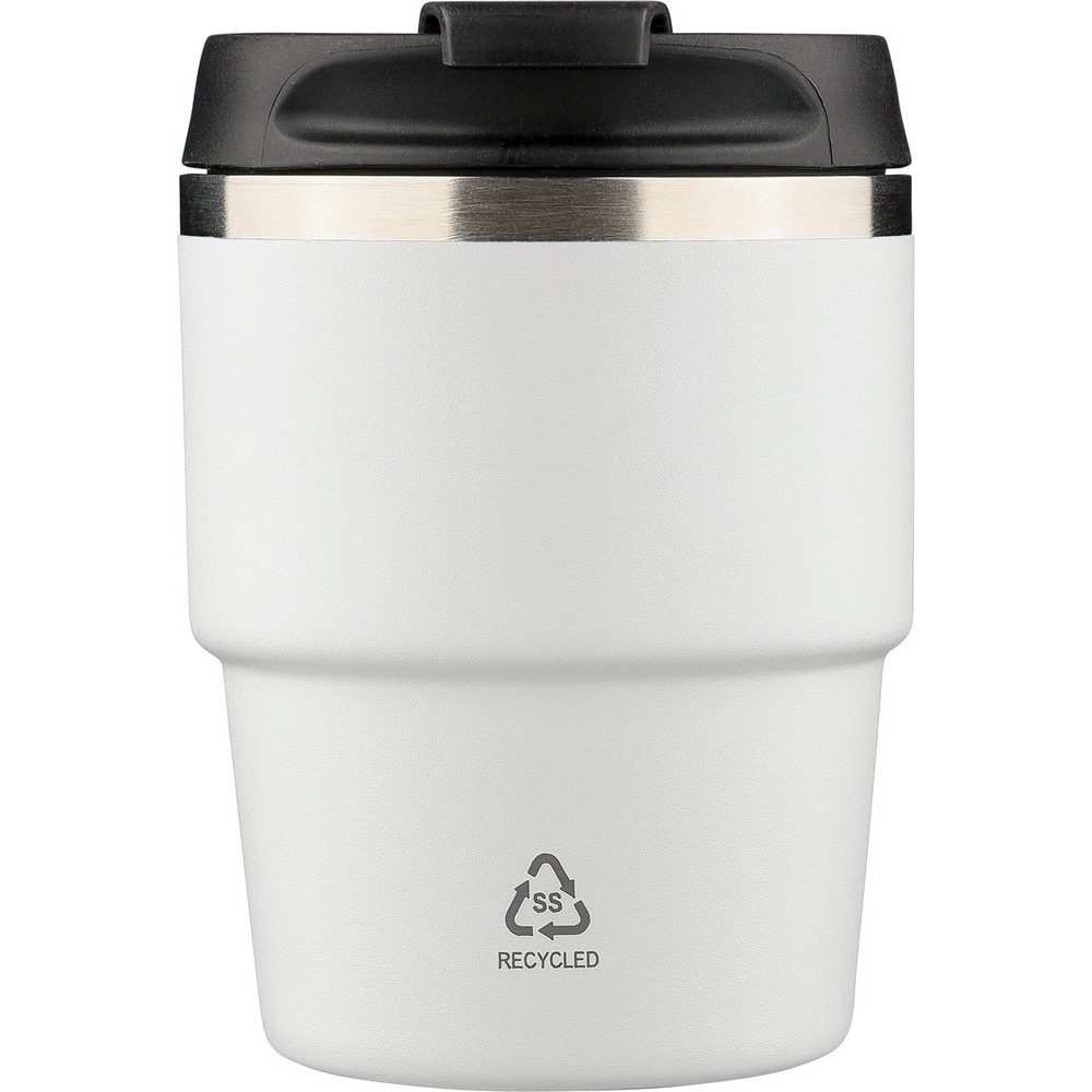 Kubek termiczny 175 ml, posiada podwójne ścianki ze stali nierdzewnej z próżnią między ściankami, co spowalnia oddawanie temperatury na zewnątrz, zachowując funkcje termosu, ikona recyklingu na produkcie, zapakowany pojedynczo w brązowe kartonowe pudełko, produkt wykonany z recyklingowej stali nierdzewnej (wewnątrz 304 / na zewnątrz 201) z pokrywką z PP