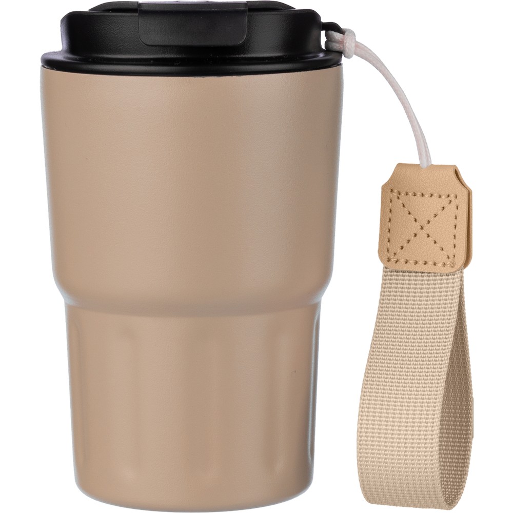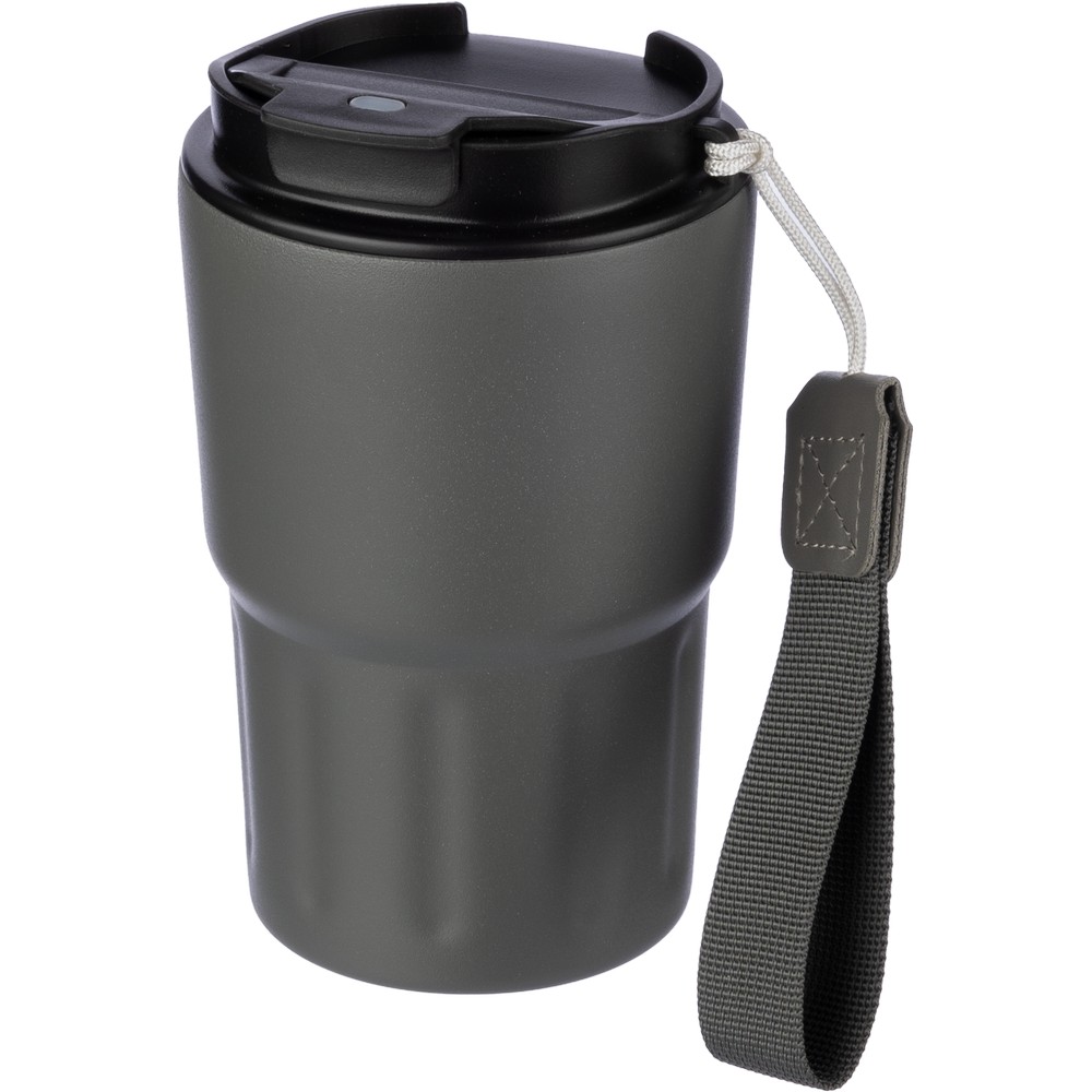Kubek termiczny 320 ml, posiada podwójne ścianki ze stali nierdzewnej z próżnią między ściankami, co spowalnia oddawanie temperatury na zewnątrz, zachowując funkcje termosu, pasek ułatwiający noszenie lub przypięcie, plastikowe wieczko z otwarciem umożliwiającym łatwą obsługę jedną ręką, dobrze trzyma temperaturę ciepłych i zimnych napojów, utrzymuje temperaturę napojów gorących do 10 godzin +leakproof
