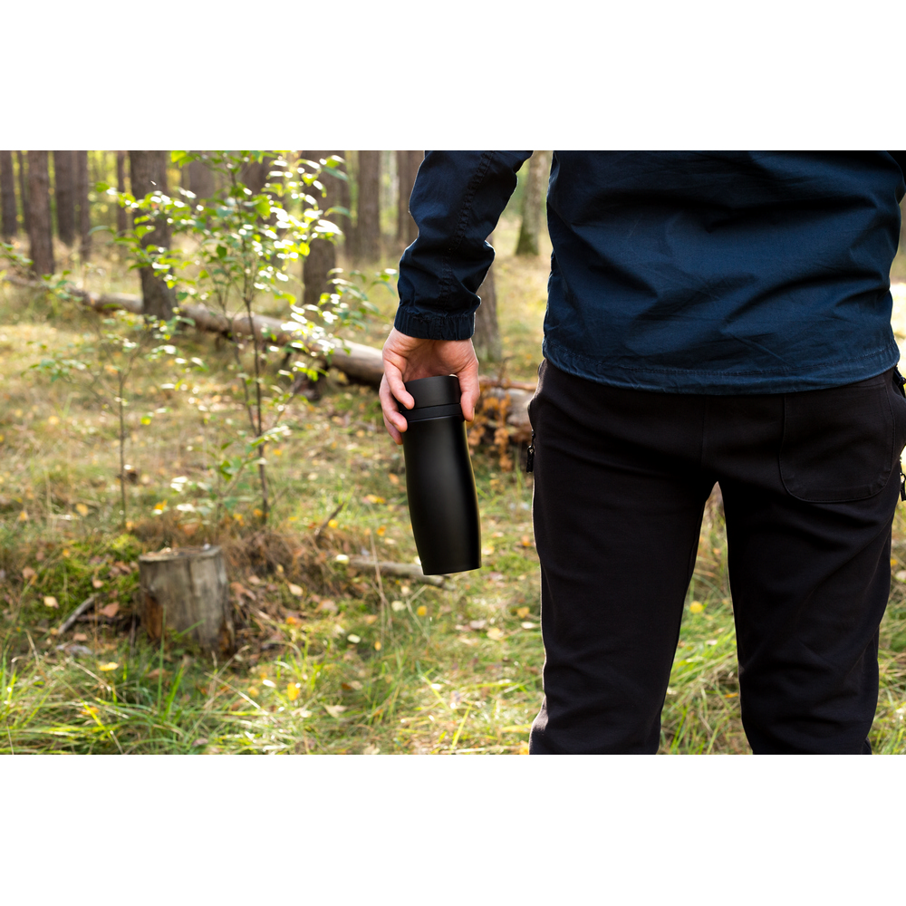 Kubek termiczny 375 ml Air Gifts, posiada podwójne ścianki ze stali nierdzewnej z miedzianą izolacją próżniową, co spowalnia oddawanie temperatury na zewnątrz, zachowując funkcje termosu, plastikowe wieczko z przyciskiem otwarcia/zamknięcia ustnika umożliwiającym obsługę jedną ręką, matowe wykończenie, utrzymuje temperaturę napojów gorących do 15 godzin +leakproof