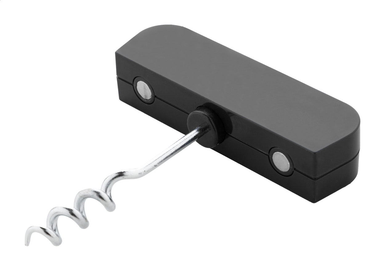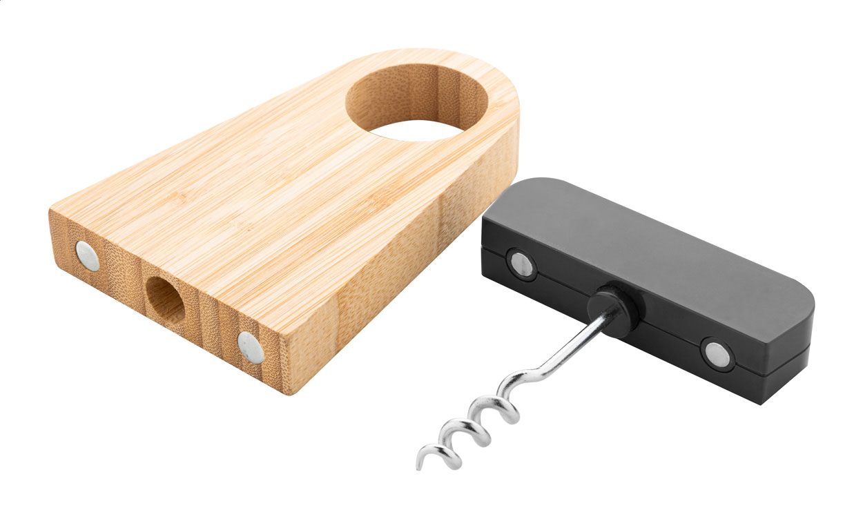 Stojak na butelkę wina wykonany z bambusa i poddanego recyklingowi tworzywa ABS, ze stalowym korkociągiem.