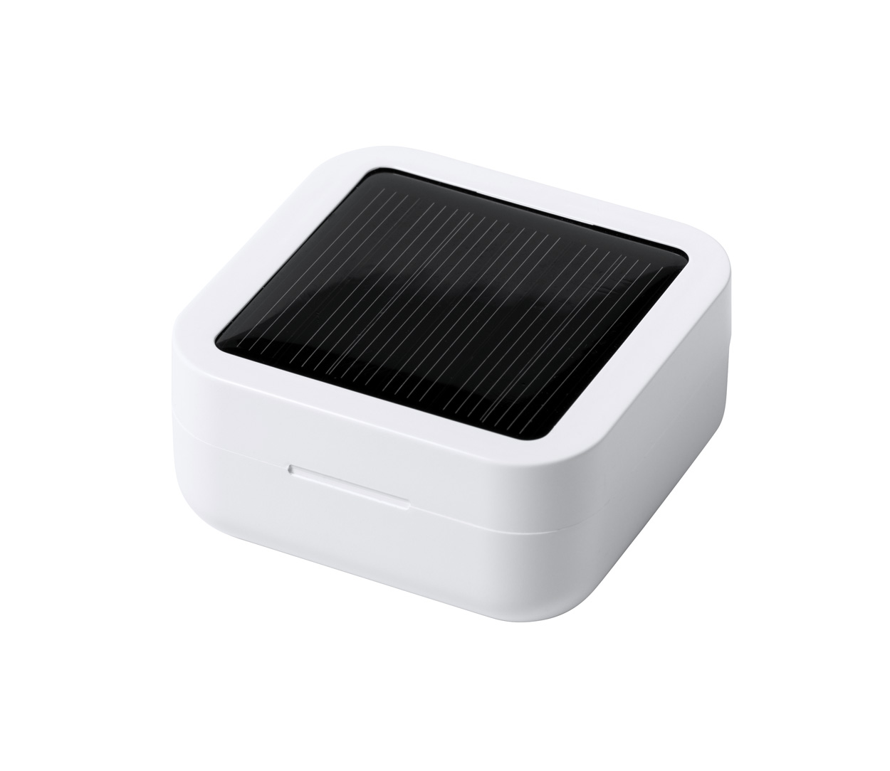 Prawdziwie bezprzewodowe słuchawki stereo (TWS) z funkcją zestawu głośnomówiącego w plastikowym etui z ładowarką słoneczną. W zestawie kabel USB do ładowania.