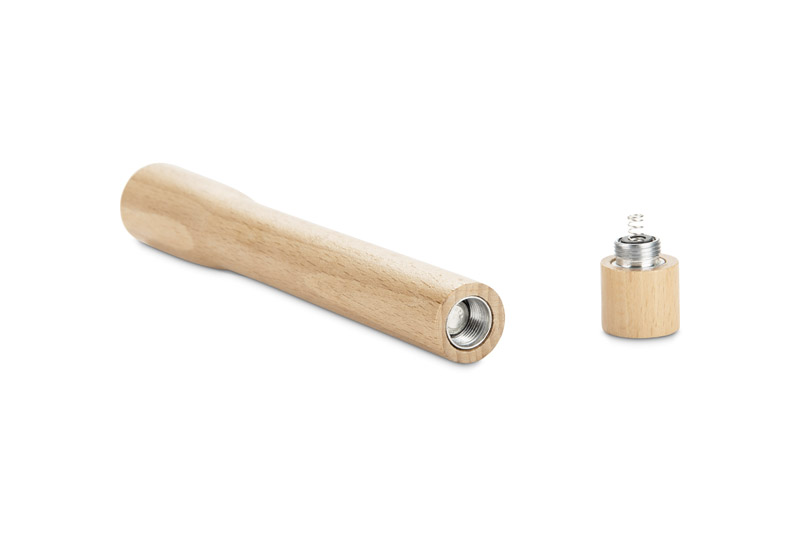 Latarka TIMBERA wykonana jest z drewna bukowego i wyposażona w źródło światła o mocy 5 W. Zasilana trzema bateriami AAA (niedołączonymi do zestawu) sprawdza się w codziennym użytkowaniu w domu, w pracy czy w plenerze. Drewniana obudowa nadaje jej solidny charakter i stanowi dobre tło pod znakowanie logo. Prosta forma oraz wygodny rozmiar czynią z niej praktyczny gadżet reklamowy, który będzie zawsze pod ręką.