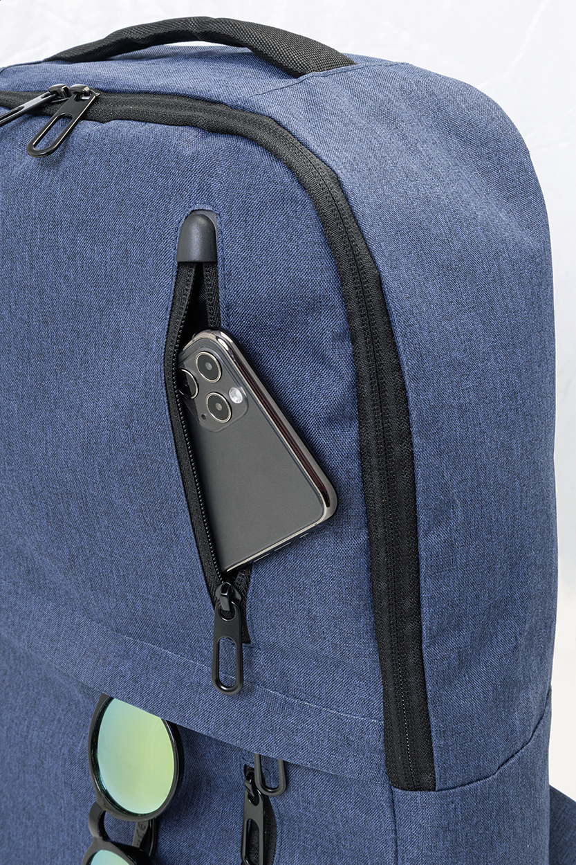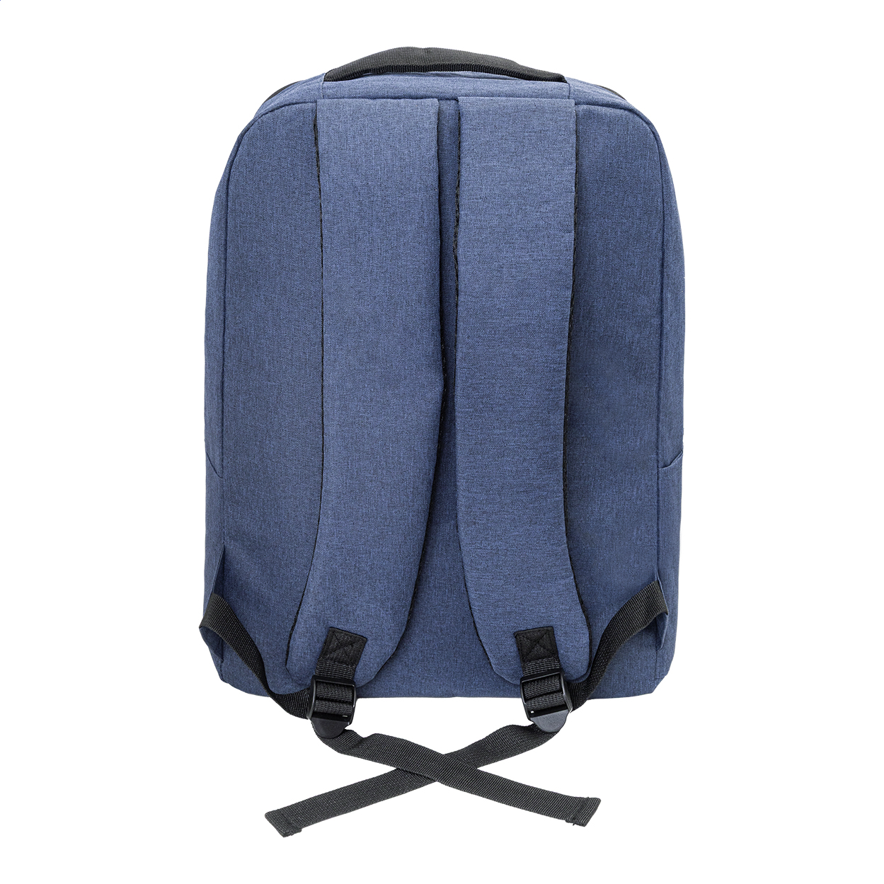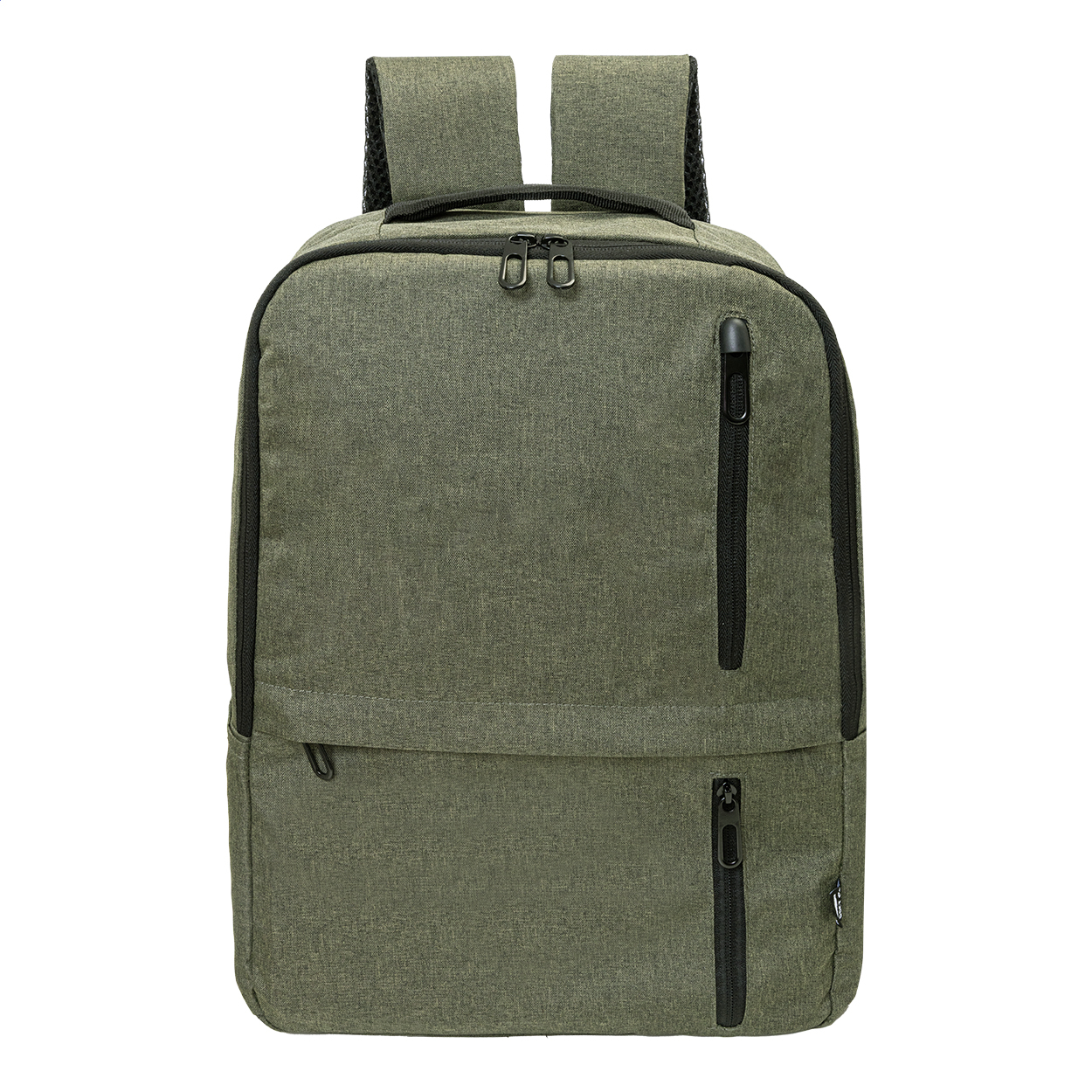 Plecak RPET z główną komorą zapinaną na zamek i trzema przednimi kieszeniami zapinanymi na zamek. Z wyściełanymi przegrodami na tablet (10″) i laptopa (15″), wyściełanymi plecami i paskami na ramię. Poliester RPET 600D, z charakterystyczną metką RPET.