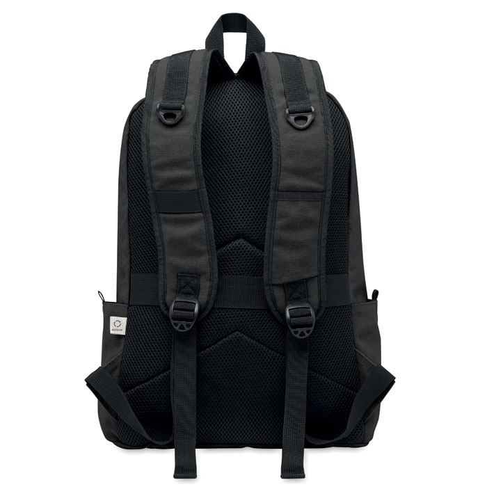 Plecak na laptopa 15 cali z bawełny z prekonsumenckiego recyklingu. Duża przednia kieszeń zapinana na zamek z wewnętrzną przegrodą na laptopa. Mała przednia kieszeń na suwak. Dwie boczne kieszenie wsuwane. Wyściełane plecy i szelki, tylny panel i spód. 450 gr/m².