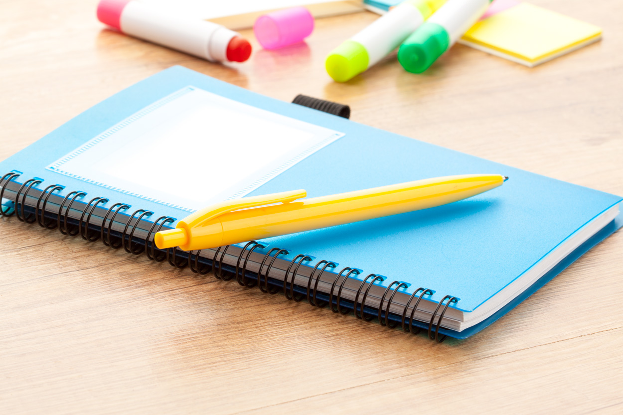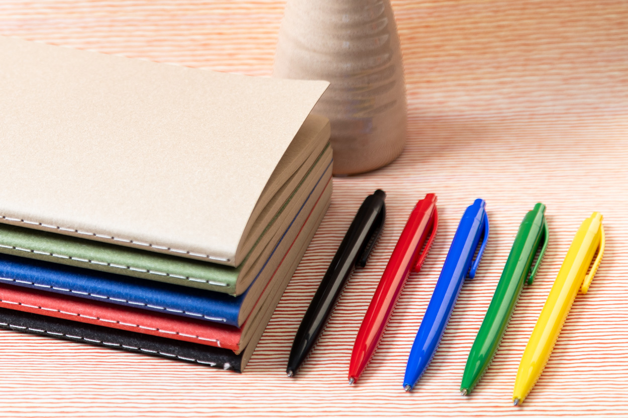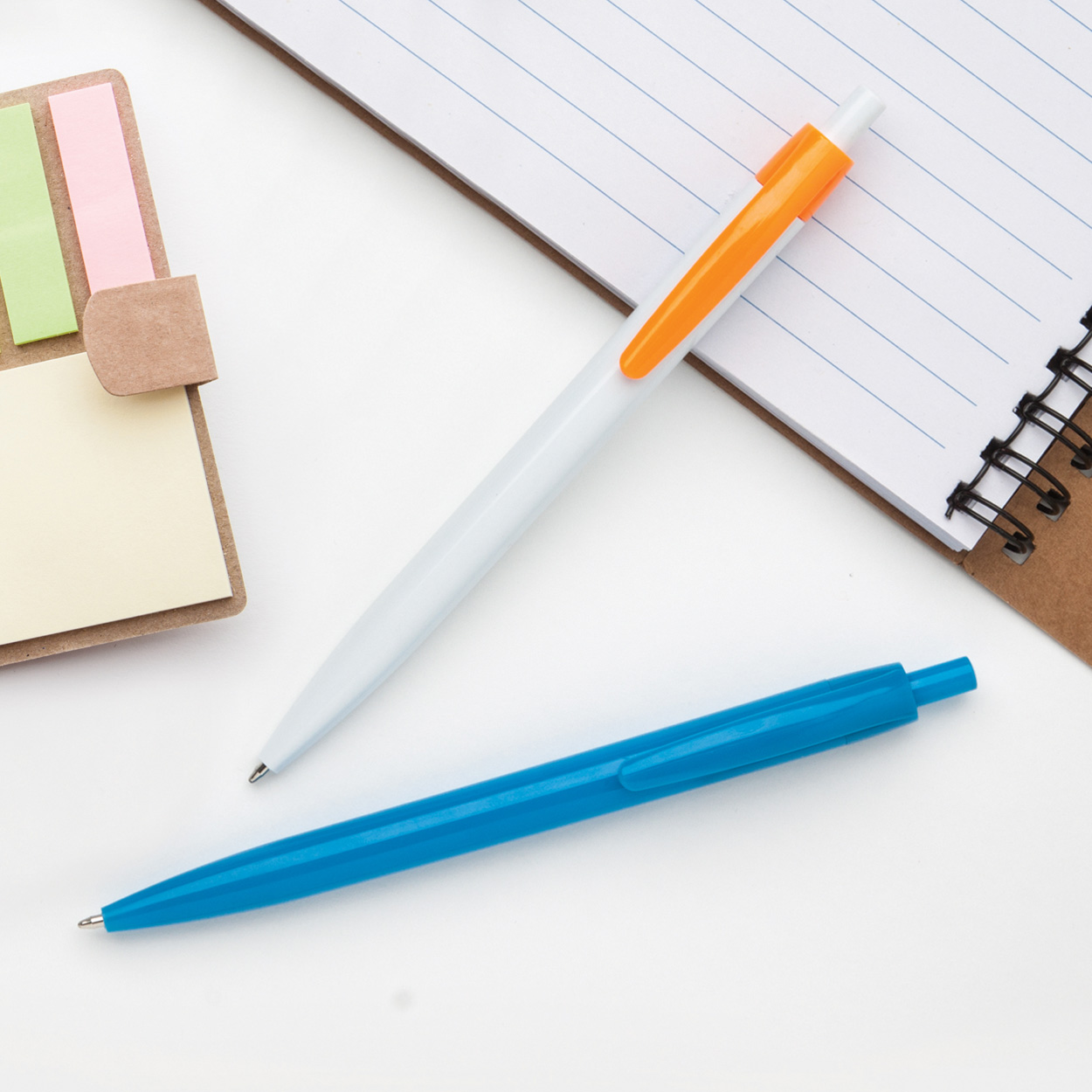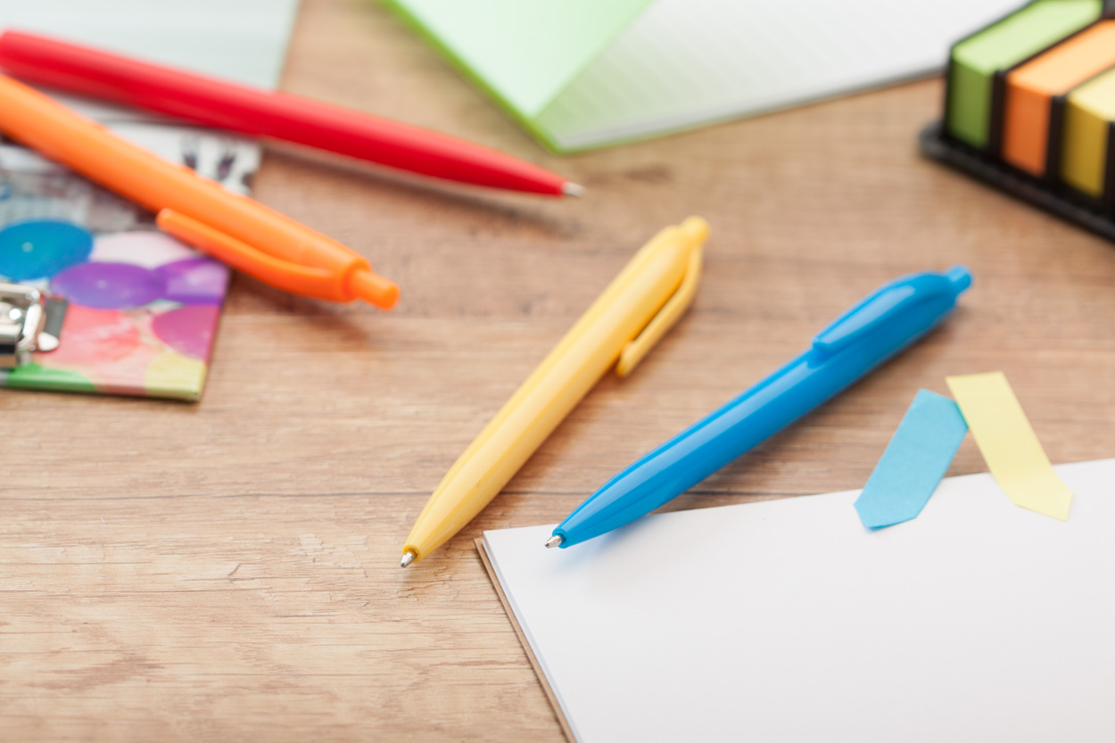 Kolorowy, plastikowy długopis z niebieskim wkładem.