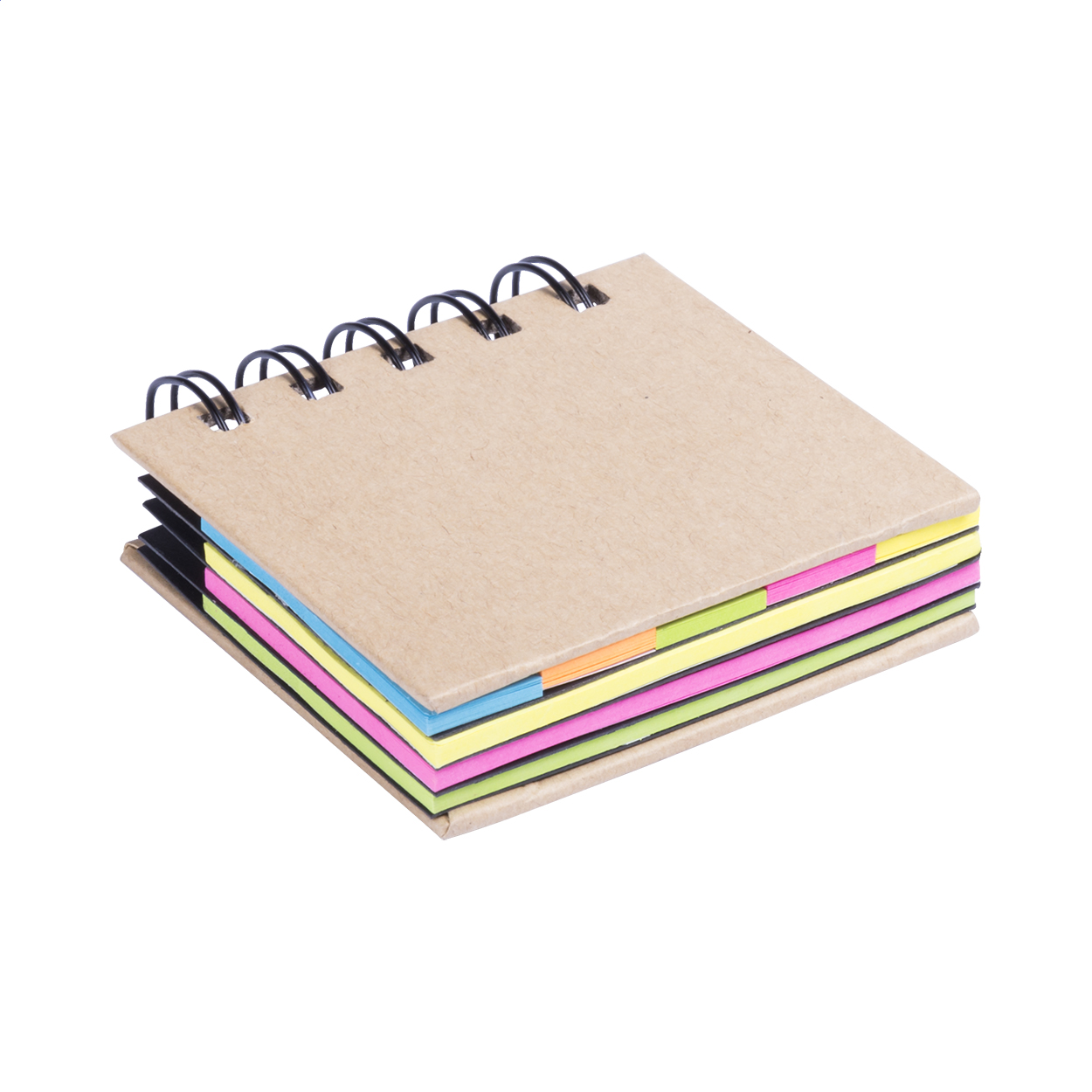 Notatnik z papieru z recyklingu ze spiralą i z karteczkami samoprzylepnymi różnych wielkości (5×25 małe i 3×25 duże).