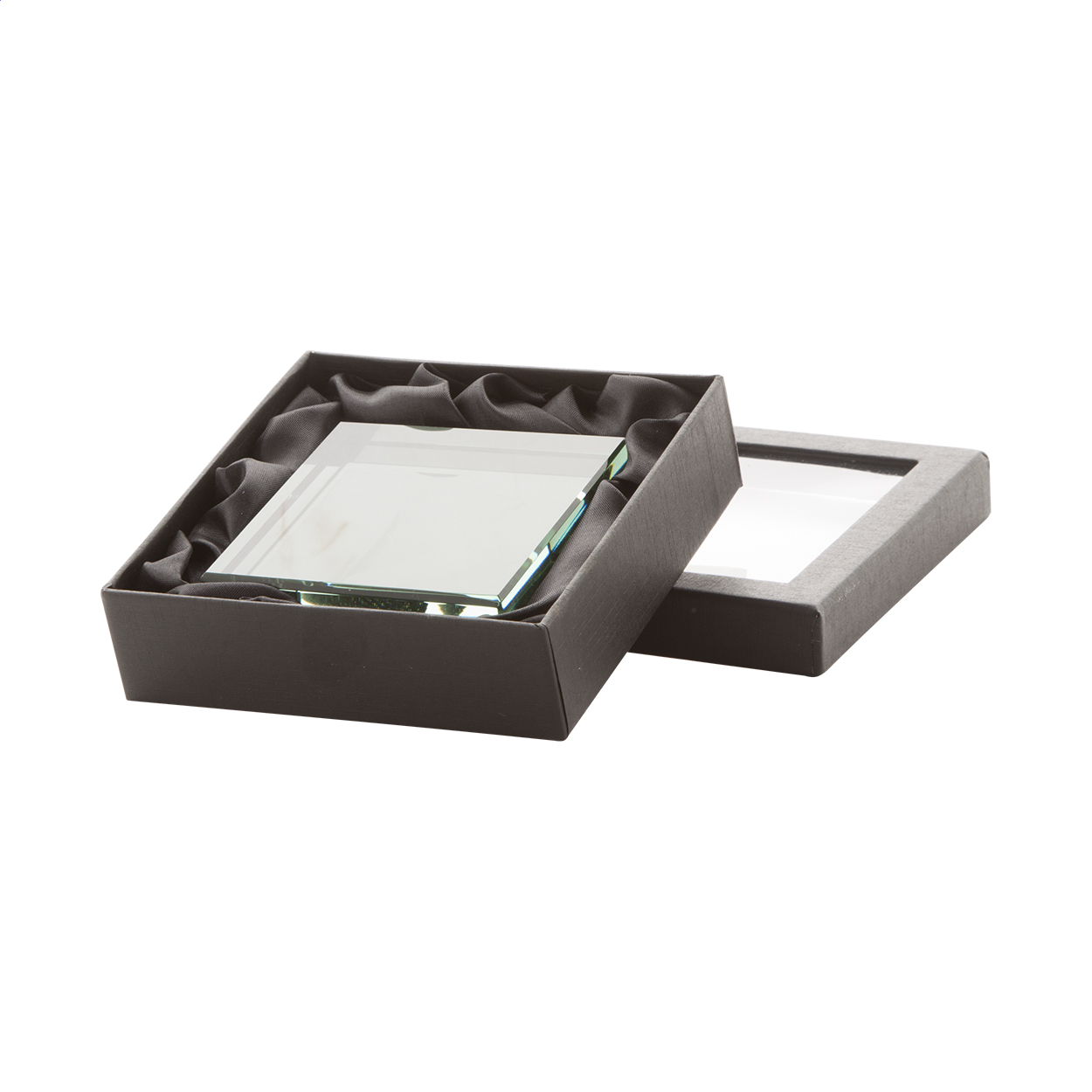 Prostokątny, szklany blok. Produkt zapakowany w pudełko z okienkiem.