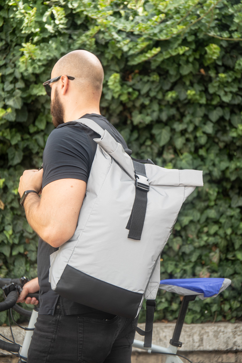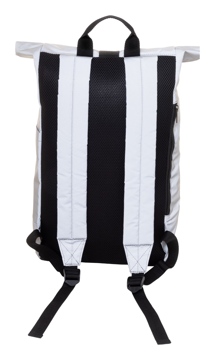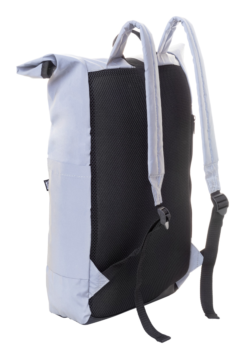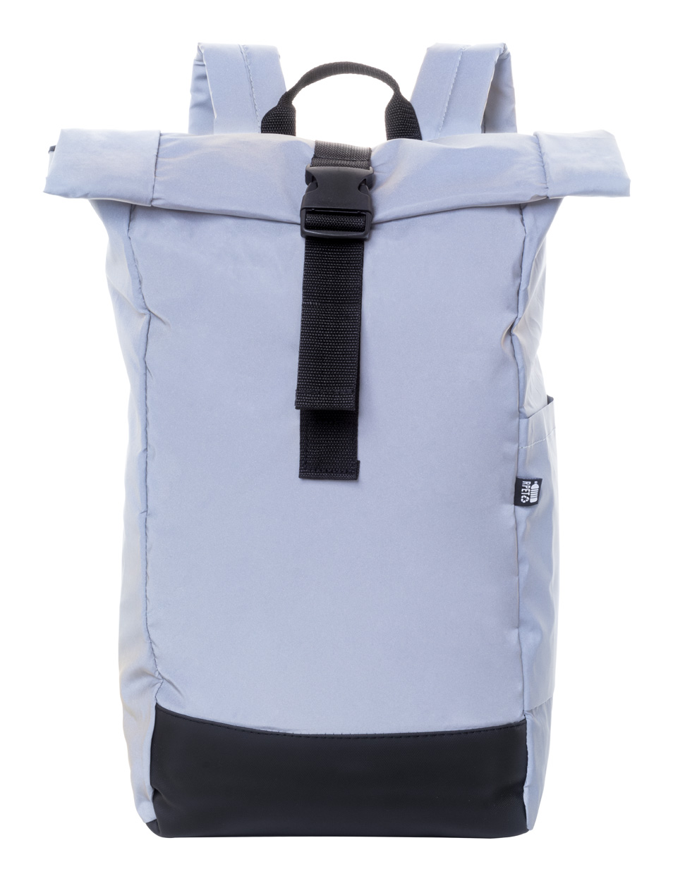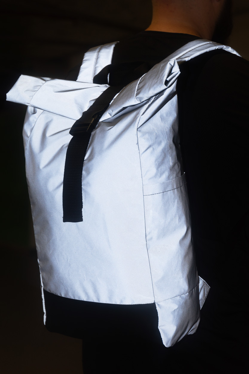 Odblaskowy plecak zwijany z poliestru RPET z kieszenią główną zapinaną na klamrę, ukrytą kieszenią na zamek, wyściełaną przegrodą na laptopa (15″), kieszenią boczną, wyściełanymi plecami i paskami na ramiona. Z charakterystyczną metką RPET. Produkt przeznaczony wyłącznie do celów promocyjnych nie kwalifikuje się jako sprzęt ochrony osobistej.