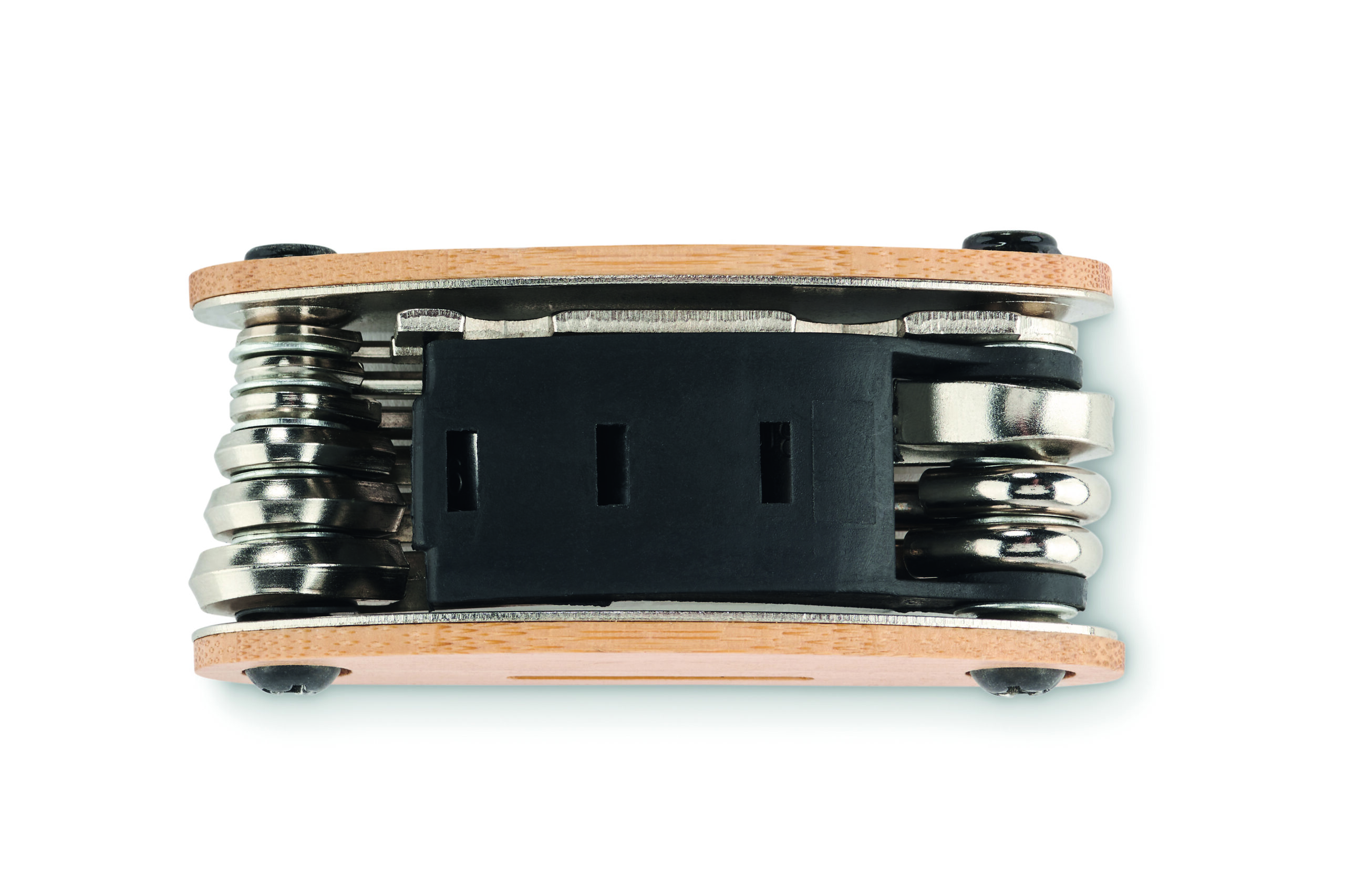Wielofunkcyjne narzędzie kieszonkowe ze stali nierdzewnej z bambusowej obudowie. 11 funkcji. Zawiera: klucze sześciokątne, klucz płaski, przedłużkę tulei, śrubokręt krzyżakowy i klucz nasadowy.