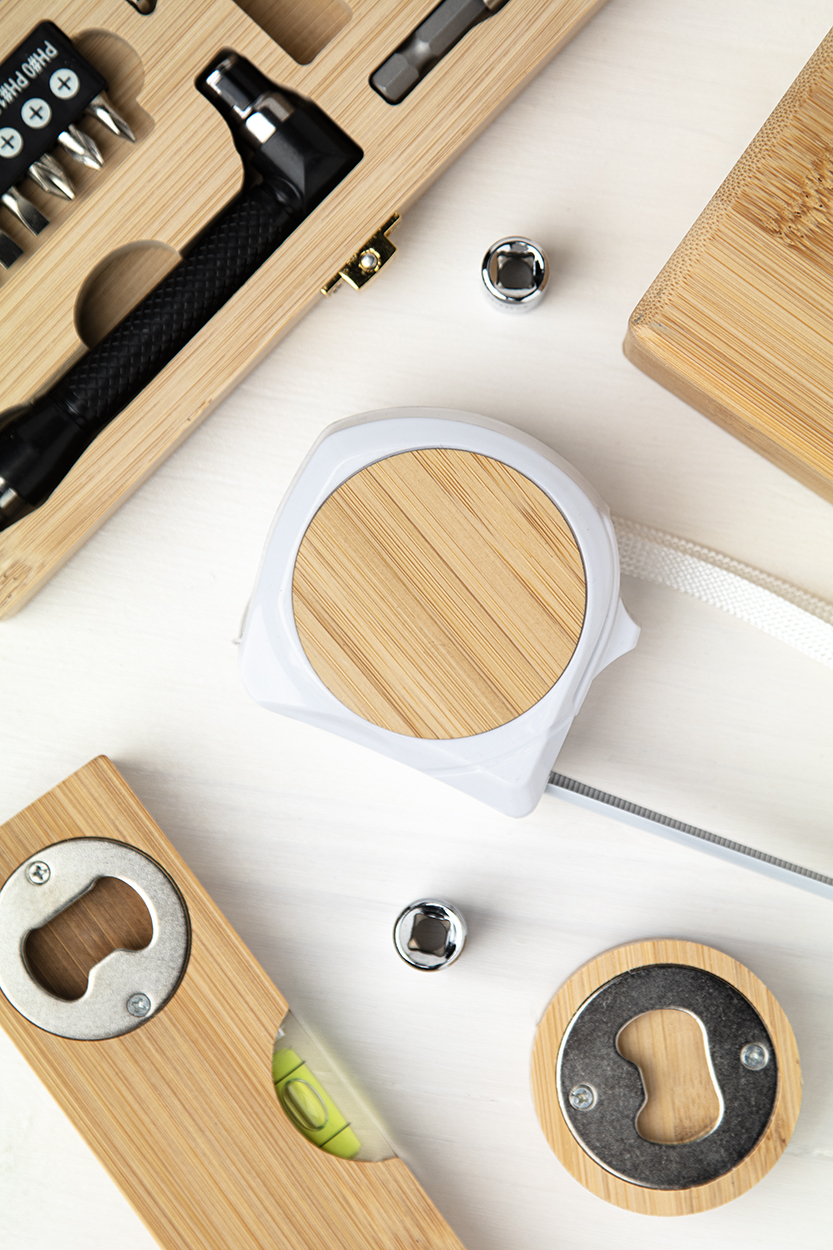 Okrągły bambusowy otwieracz do butelek z jedno metrową miarką.