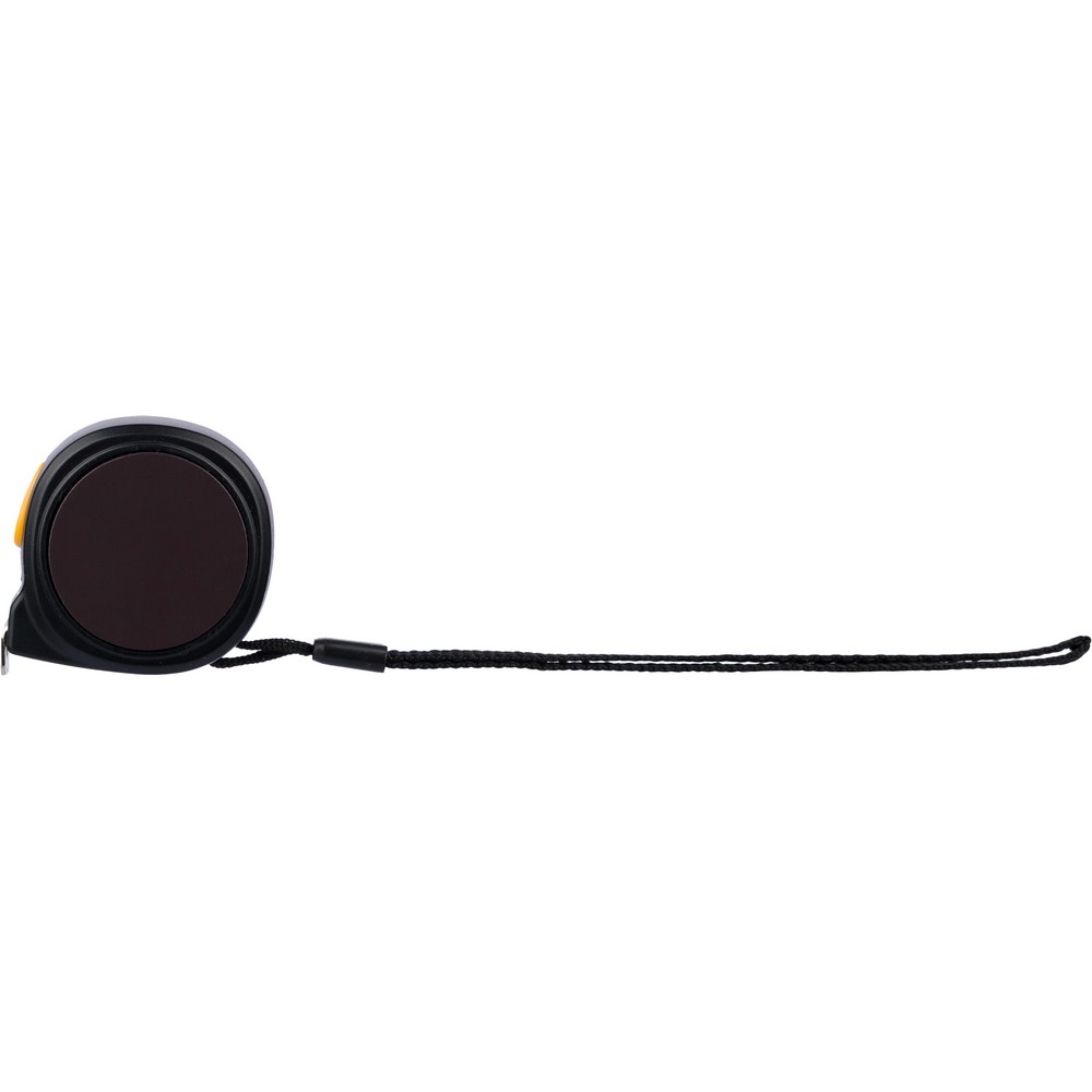 Miarka magnetyczna o długości 3 metrów, cale i centymetry, przycisk na wierzchu zwalniający blokadę, opaska na nadgarstek, zapakowana pojedynczo w brązowy kartonik, produkt wykonany z ABS, metalu i poliestru