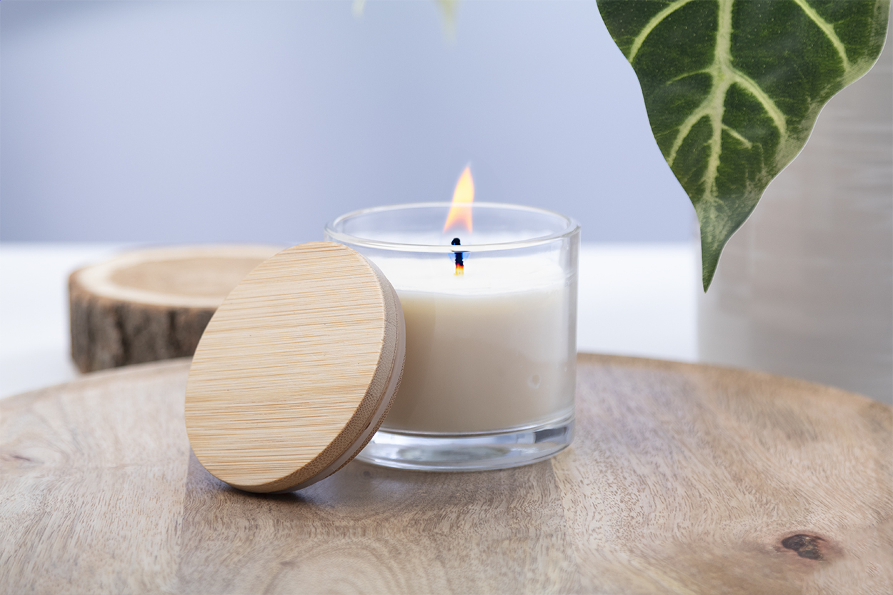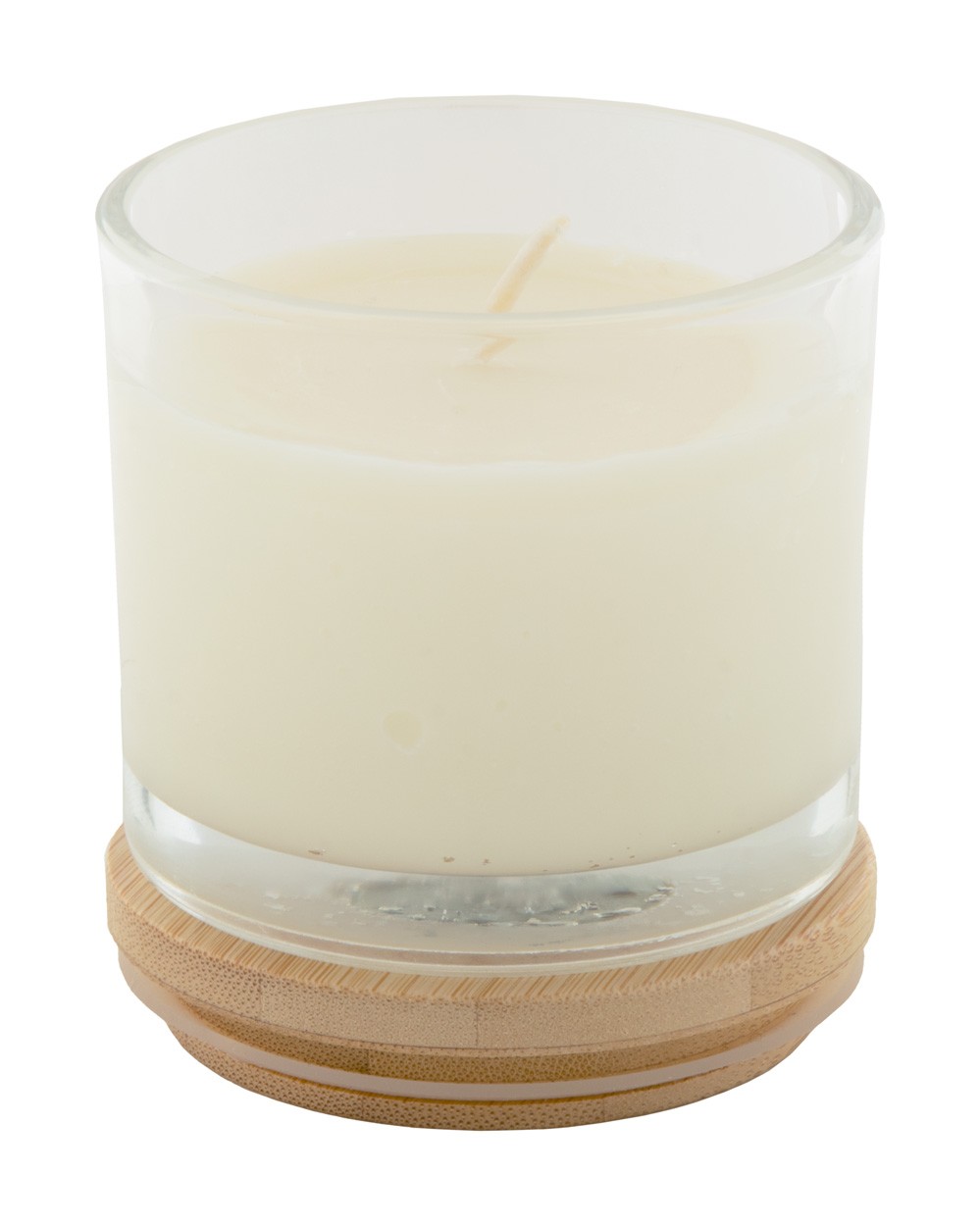 Świeca woskowa o zapachu wanilii na bazie roślin w szklanym pojemniku z bambusową pokrywką. Z 95 gramami wosku. W kartoniku.