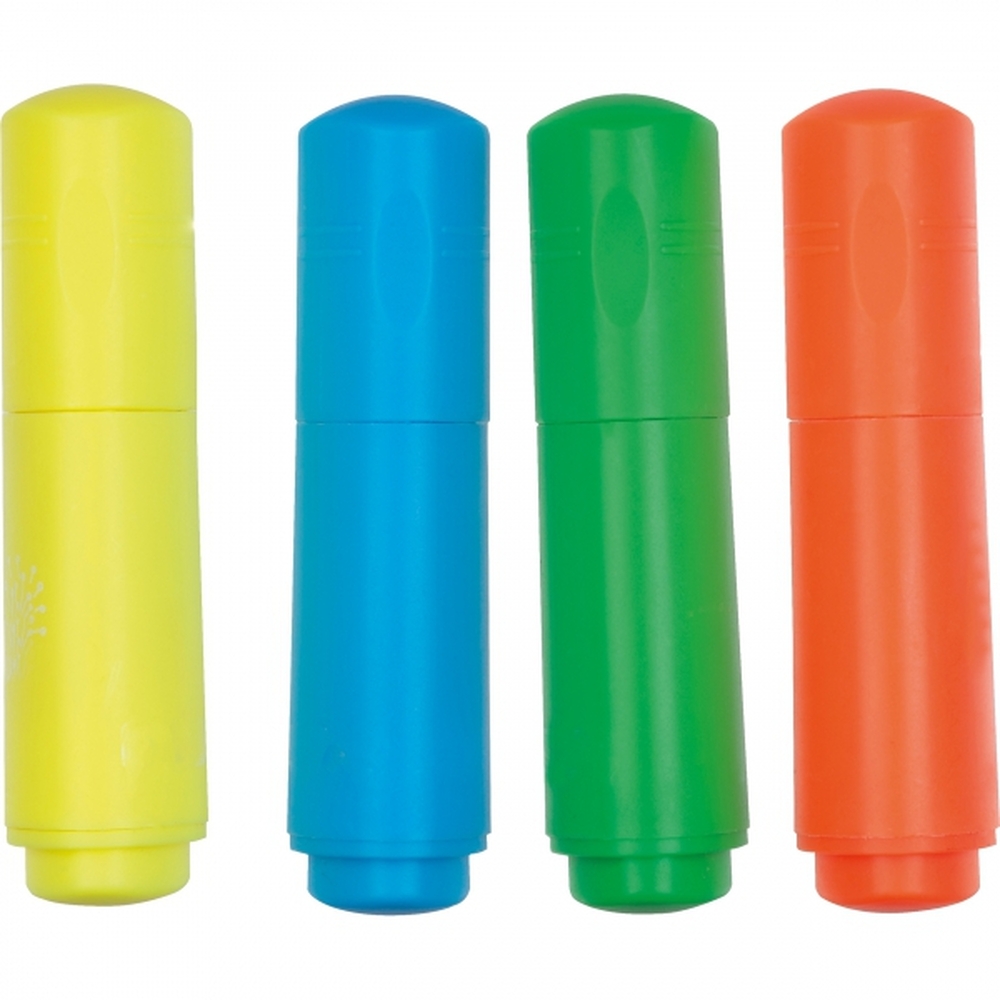 Zestaw 4 mini zakreślaczy w kolorze żółtym, niebieskim, zielonym i pomarańczowym, zapakowanych w kartonowe pudełko.