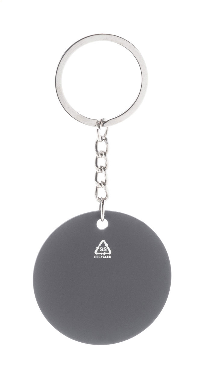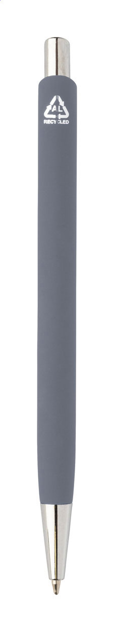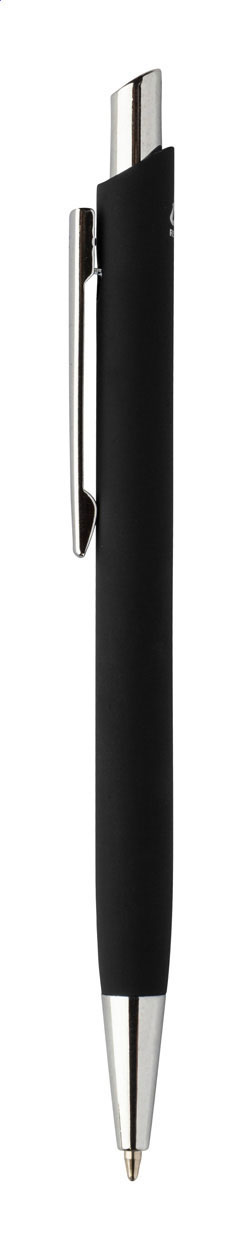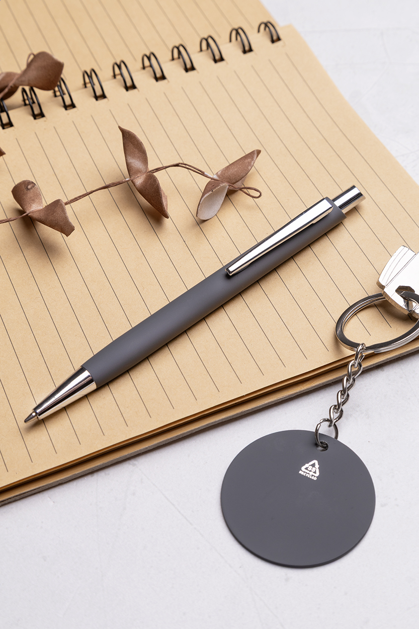 Zestaw upominkowy składający się z 2 części w czarnym papierowym pudełku. Zawiera długopis z recyklingowanego aluminium z gumowanym wykończeniem i niebieskim wkładem oraz brelok ze stali nierdzewnej z recyklingu z gumowanym wykończeniem. Oba przedmioty mają specjalną powłokę do grawerowania laserowego lustrzanego.