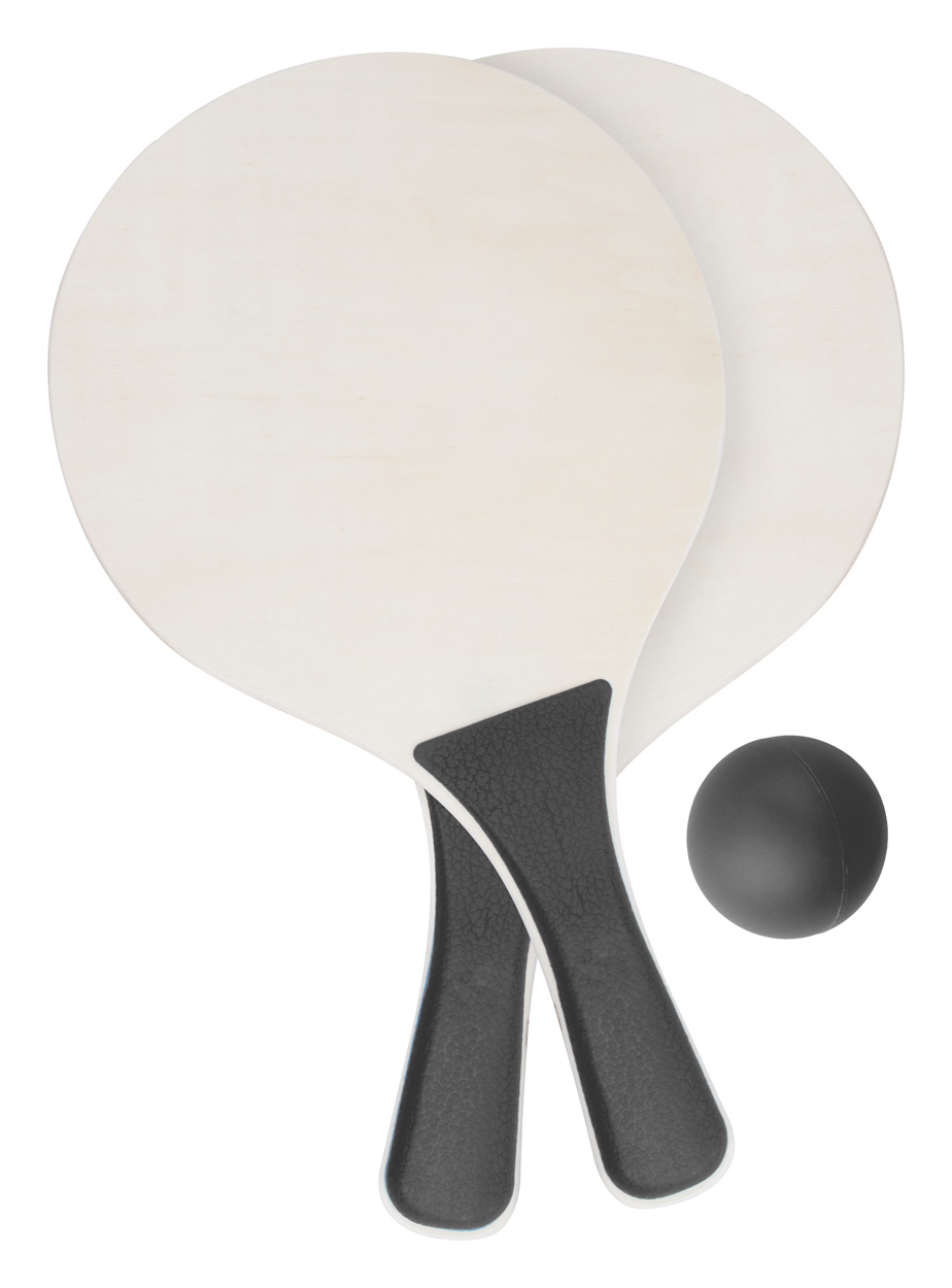 Zestaw do tenisa plażowego – 2 rakiety i 1 piłka, produkt wykonany z drewna i plastiku.