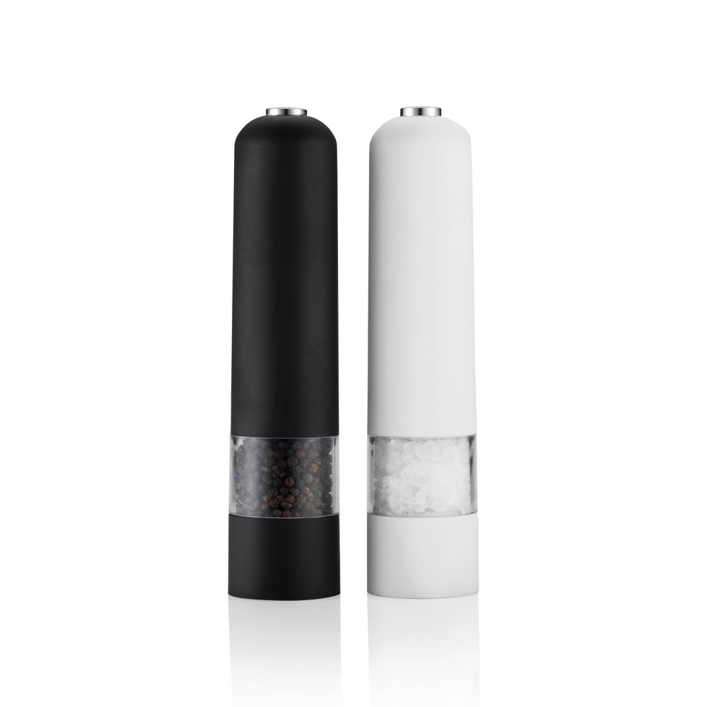 Młynek elektryczny do soli i pieprzu, wykonany z ABS, gumowe wykończenie, ceramiczny mechanizm mielący, z oświetleniem, w ozdobnym pudełku, ślad węglowy produktu: 5,4 kg CO2
