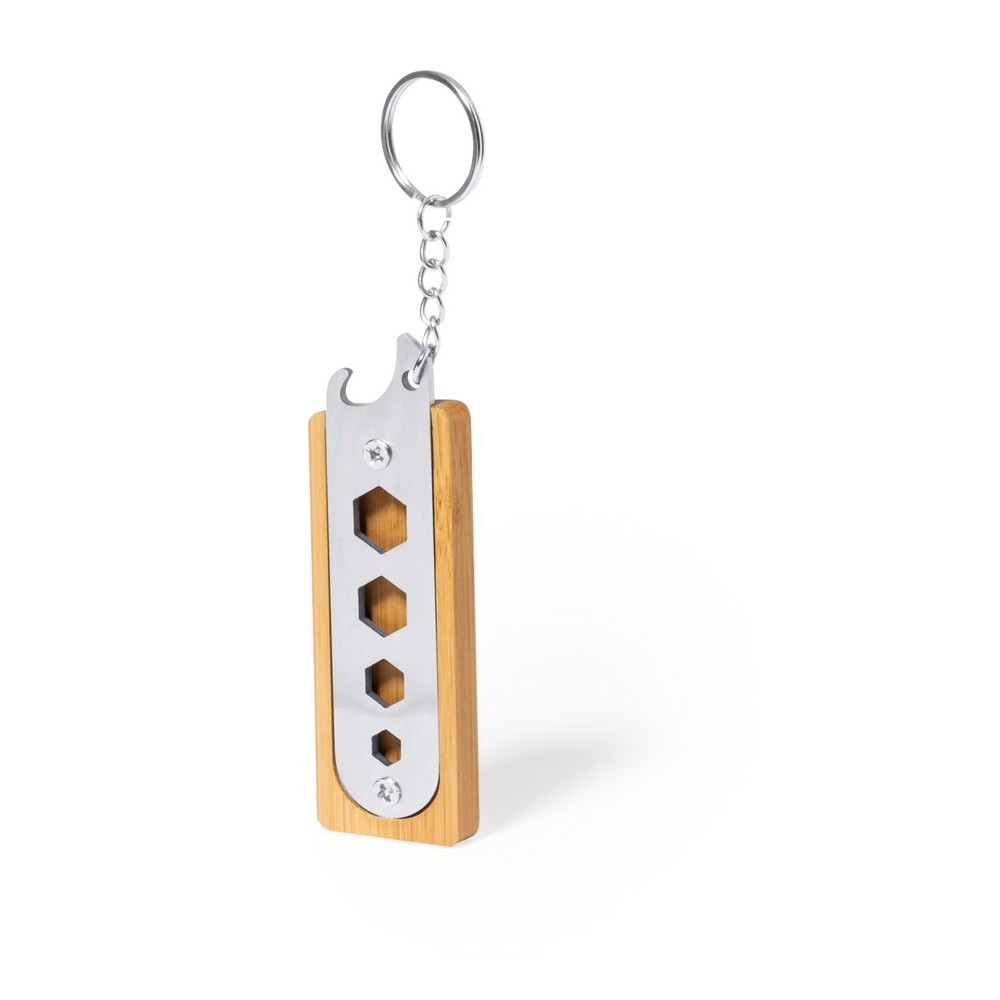 Narzędzie wielofunkcyjne w bambusowej obudowie, brelok do kluczy, 5 funkcji: 4 klucze imbusowe i otwieracz do butelek