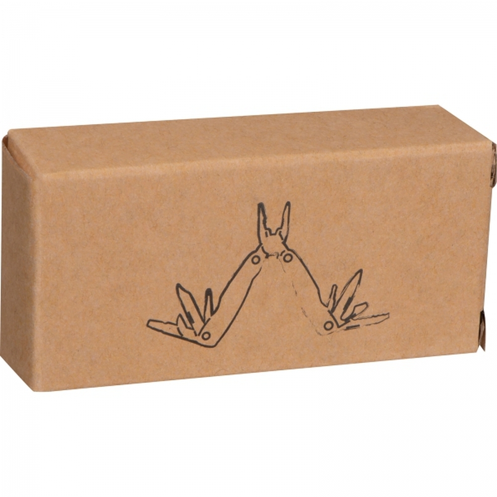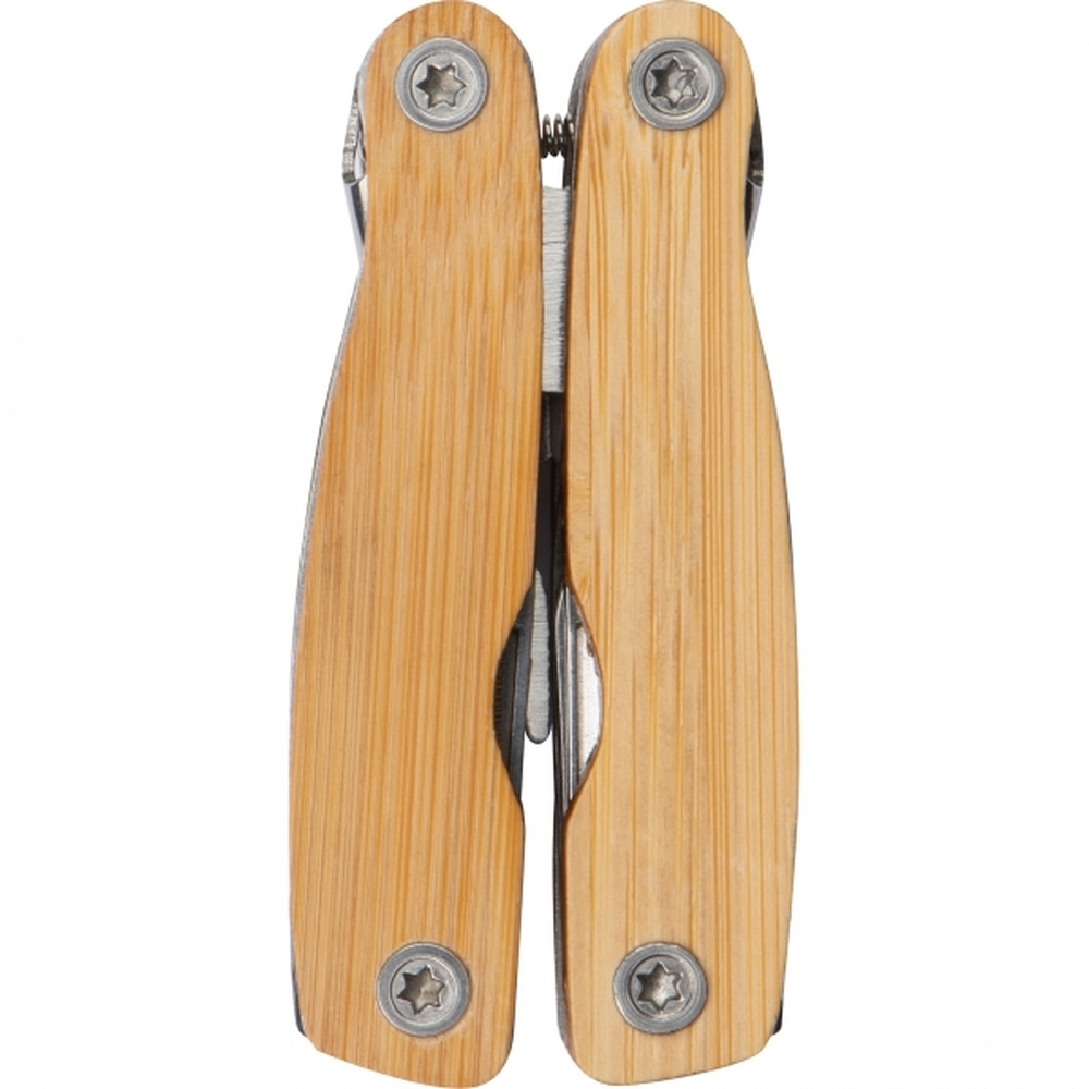 Multinarzędzie w bambusowej obudowie, wyposażone w szczypce, pilnik, śrubokręt płaski, śrubokręt krzyżakowy, nóż itp.