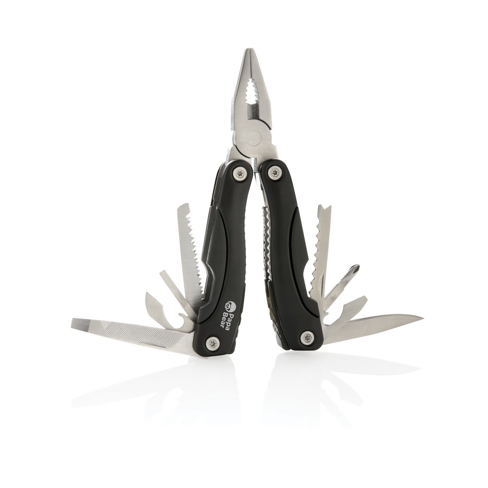 Narzędzie wielofunkcyjne, wykonane z aluminium, uchwyt z czarnymi detalami, 14 funkcji, czarny pokrowiec 600D w komplecie, ślad węglowy produktu: 2,53 kg CO2