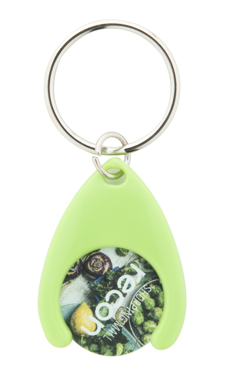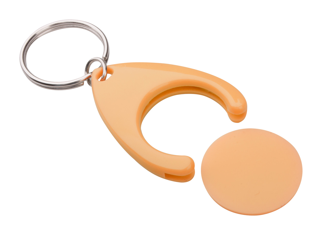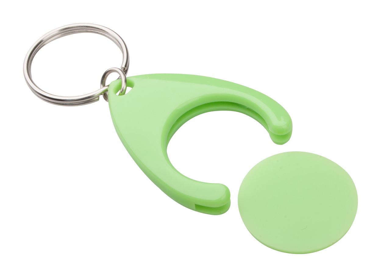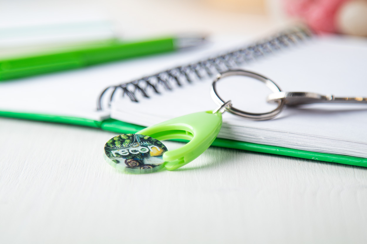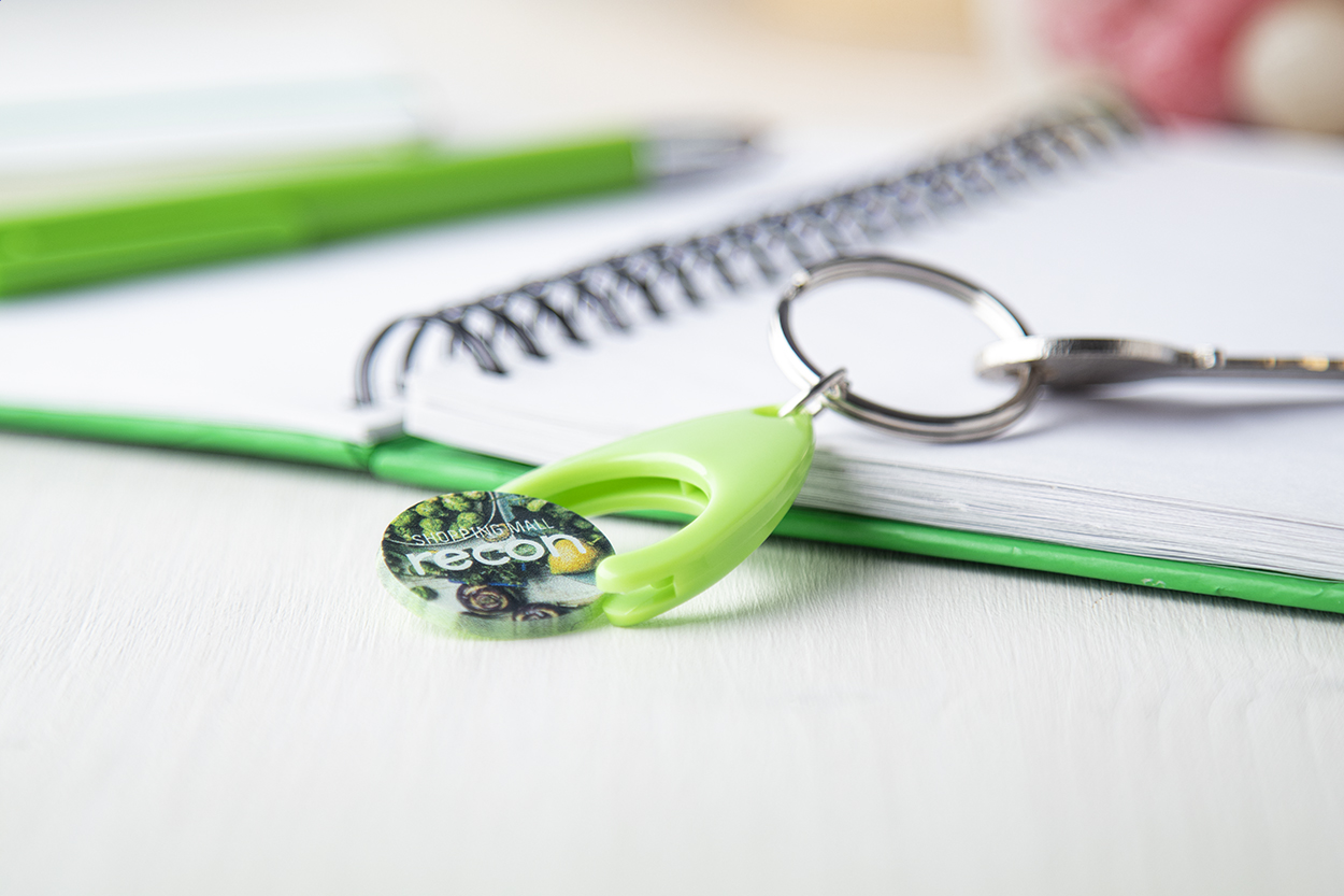 Plastikowy brelok z miejscem na monetę. Wielkość monety: ø24×2 mm.