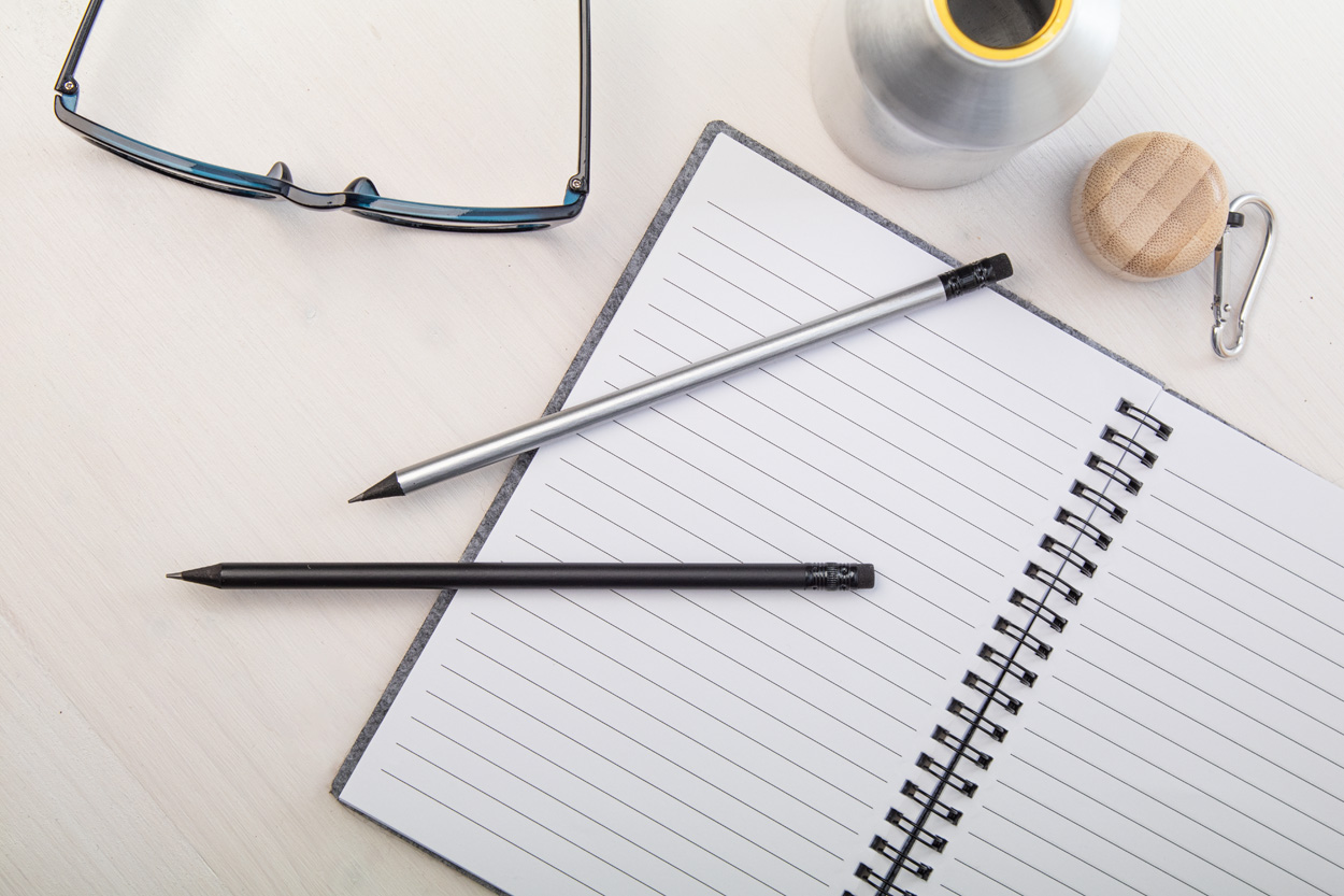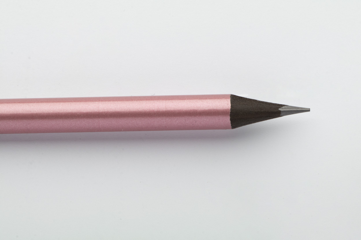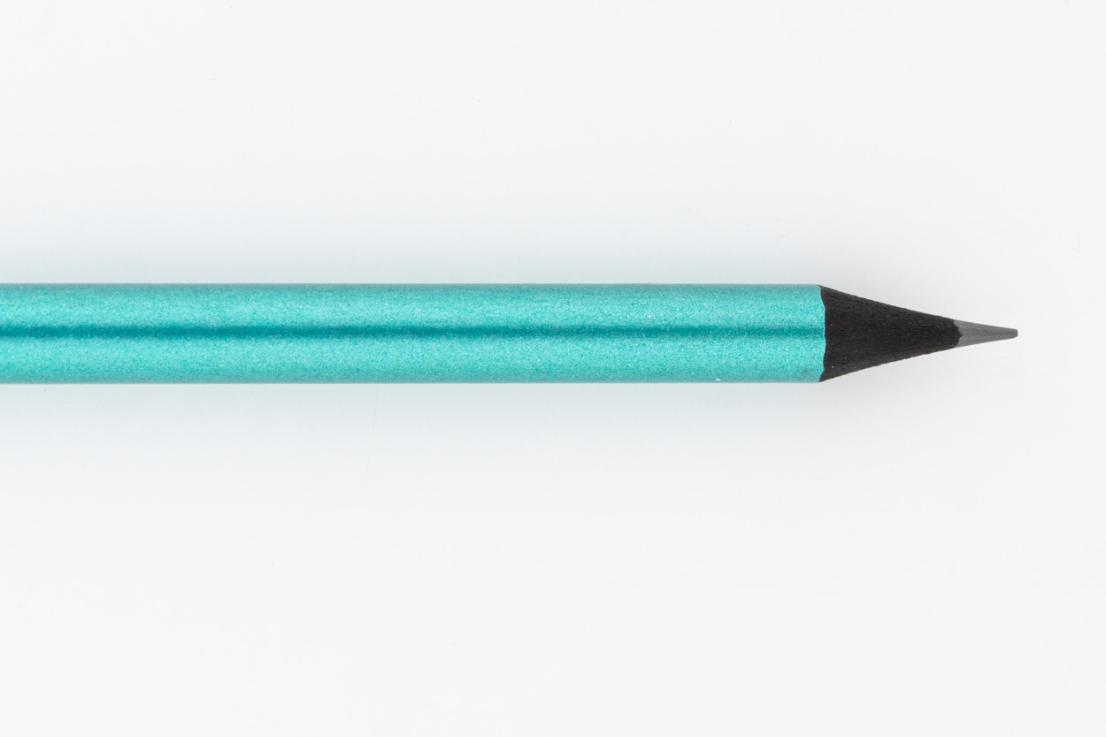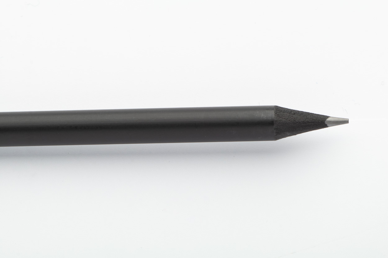 Ołówek z czarnego drewna w metalicznym wykończeniem, z czarną gumką. Zatemperowany, klasa HB.