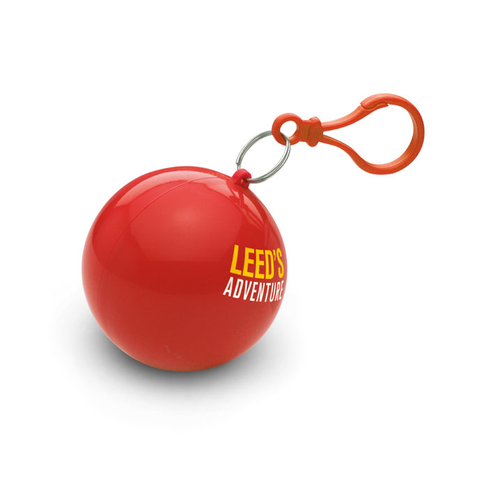 Przezroczyste ponczo przeciwdeszczowe z PE, zapakowane w okrągłe etui z AS z karabinkiem.