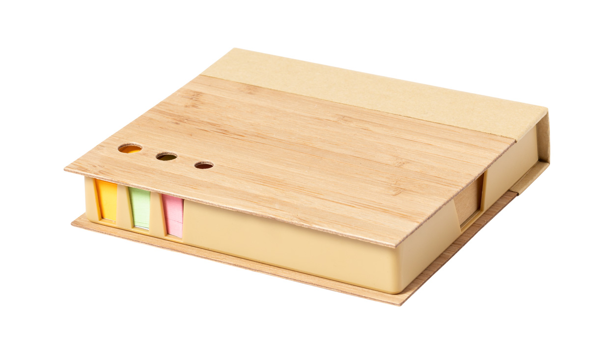 Samoprzylepny notatnik z papieru makulaturowego pokrytego bambusem, zawierający 115 dużych, 115 średnich i 420 mini karteczek samoprzylepnych (w 3 różnych kolorach).