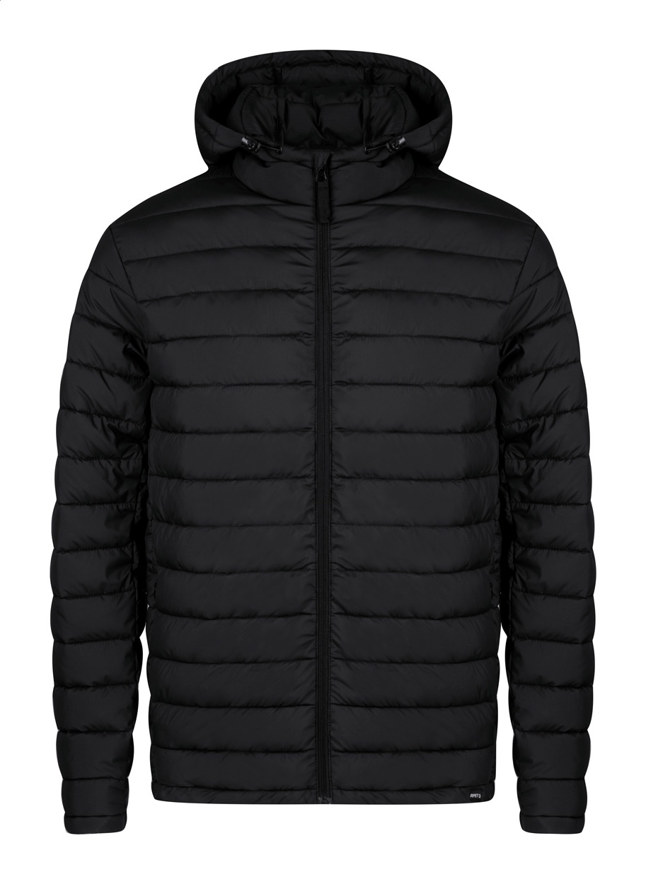Wiatroszczelna i wodoodporna, zapinana na zamek kurtka ocieplana z bocznymi kieszeniami zapinanymi na zamek i regulowanym kapturem. Z kieszenią z poliestru RPET. 100% poliester RPET z charakterystyczną metką RPET.