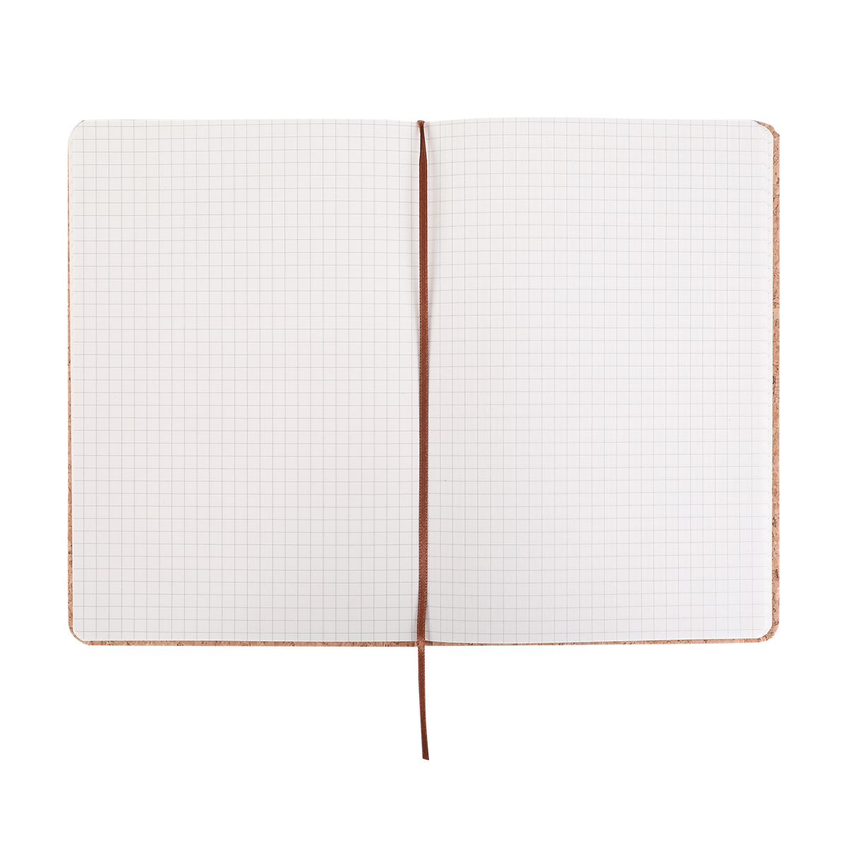 Notatnik w rozmiarze biurkowym (A5) oprawiony w okładkę z korka. 80 kartek w kratkę, papier chamois. Zamykany elastyczną taśmą.