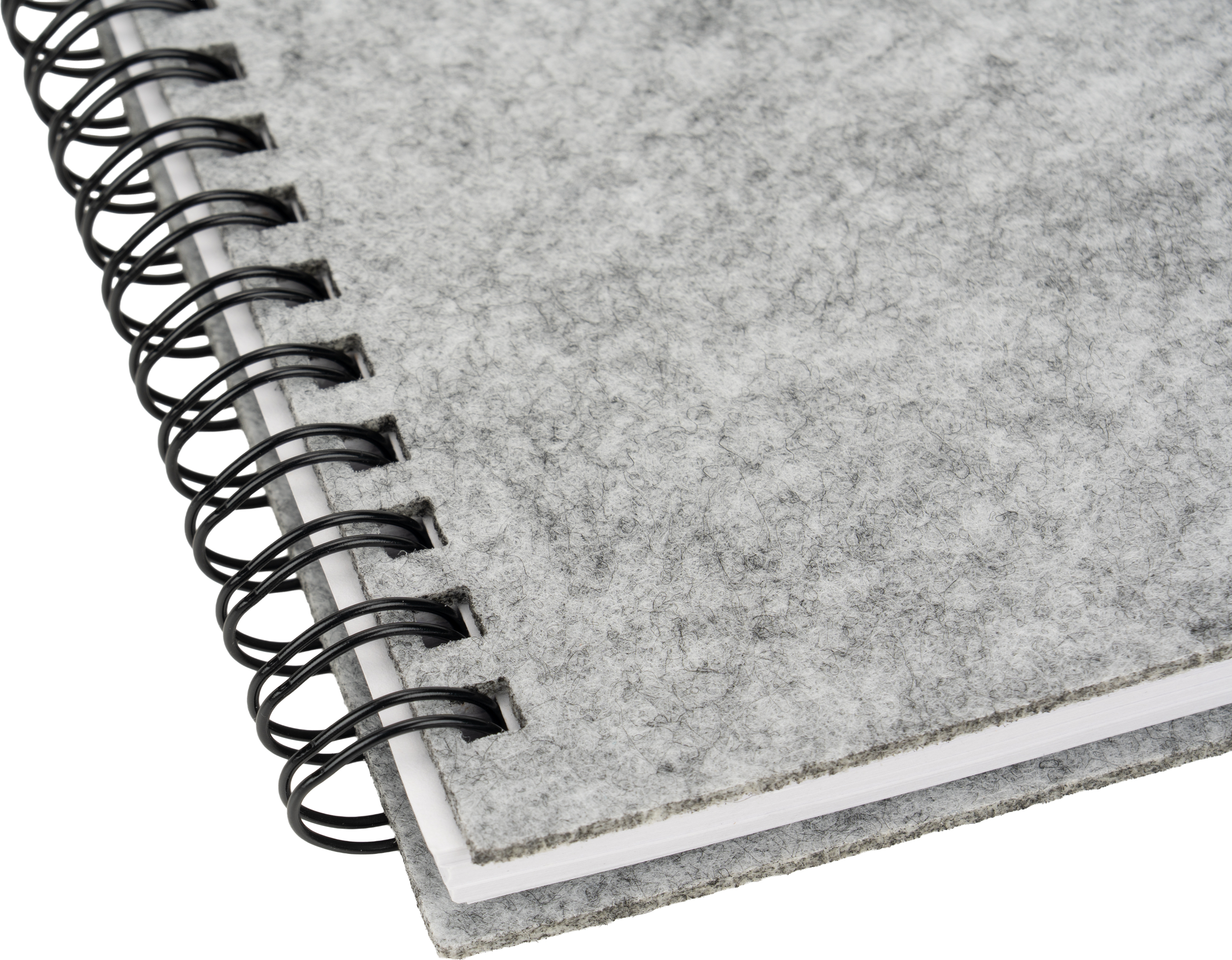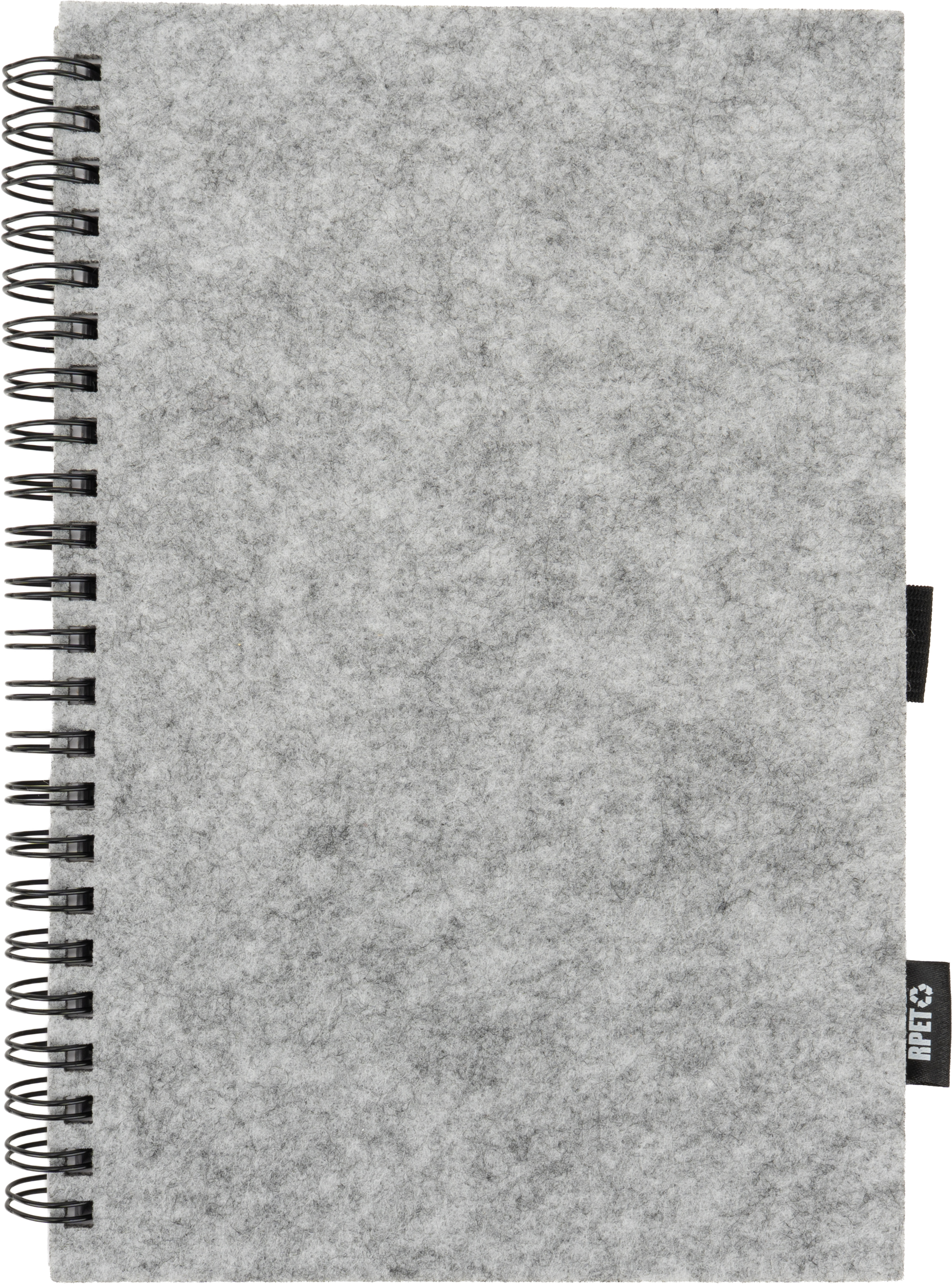 Notes wykonany z filcu RPET, o formacie A5 z 160 stronami w linie. Notes posiada spiralną oprawę i pętelkę na długopis.