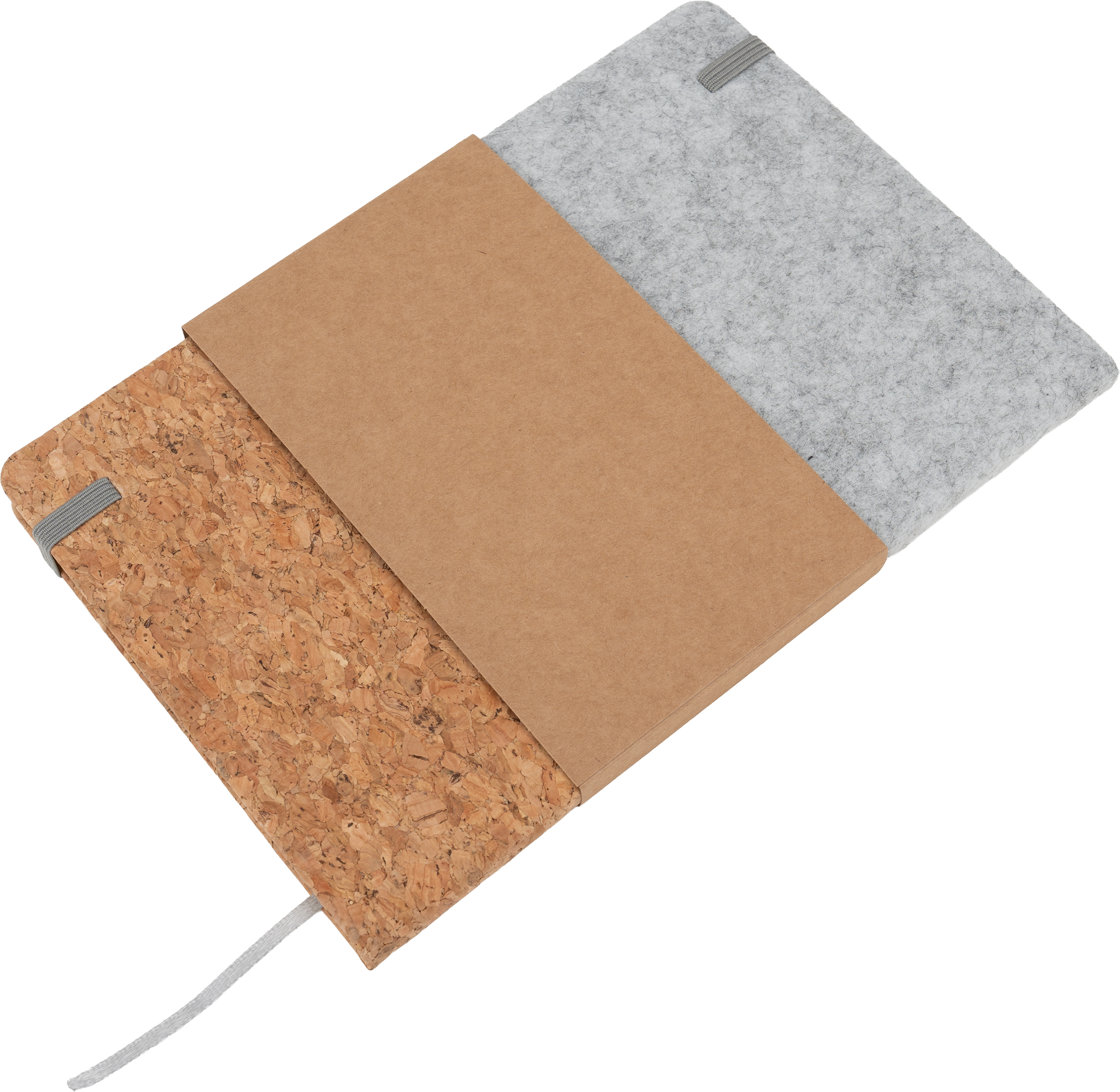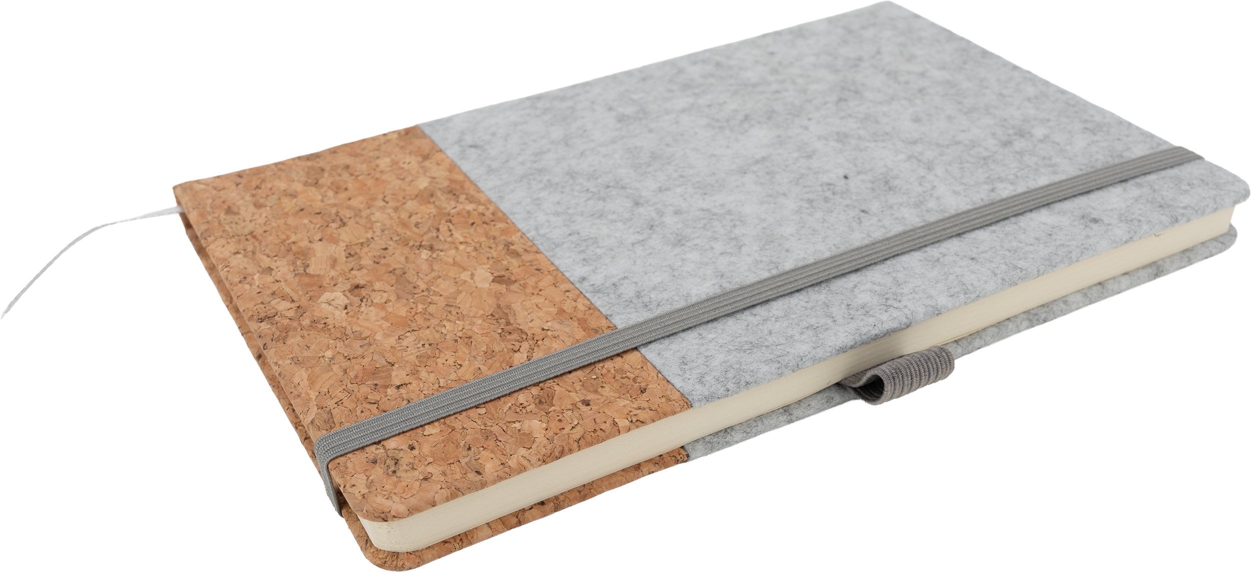 Notes A5 w oprawie z filcu i korka pochodzących z recyklingu, z gumką do zamykania i pętelką na długopis. Notes posiada 80 kartek w linie.