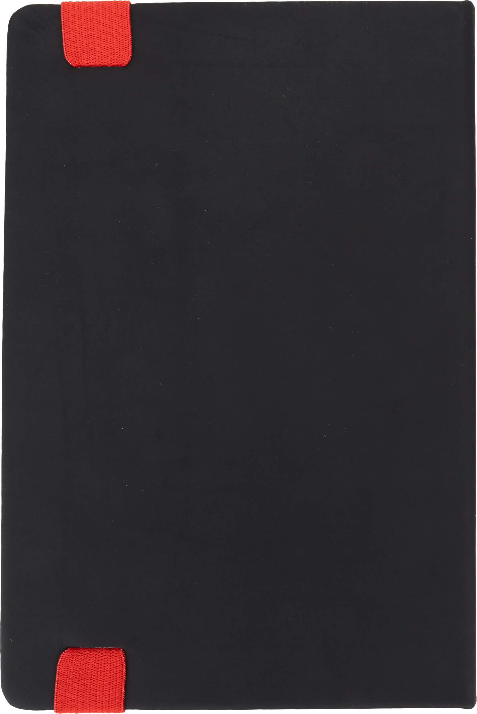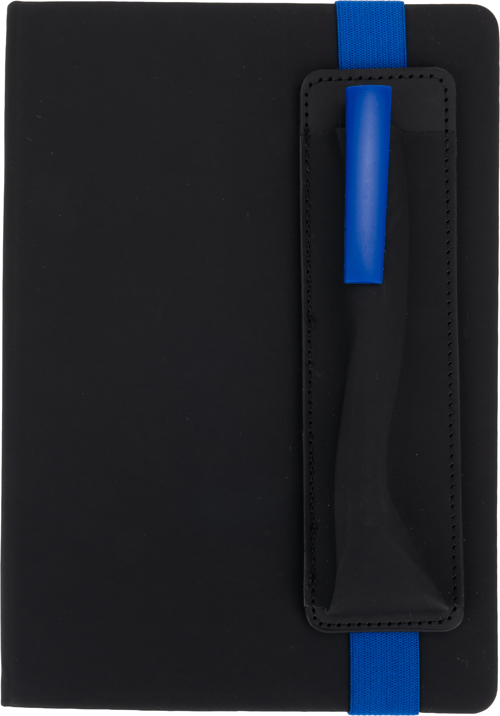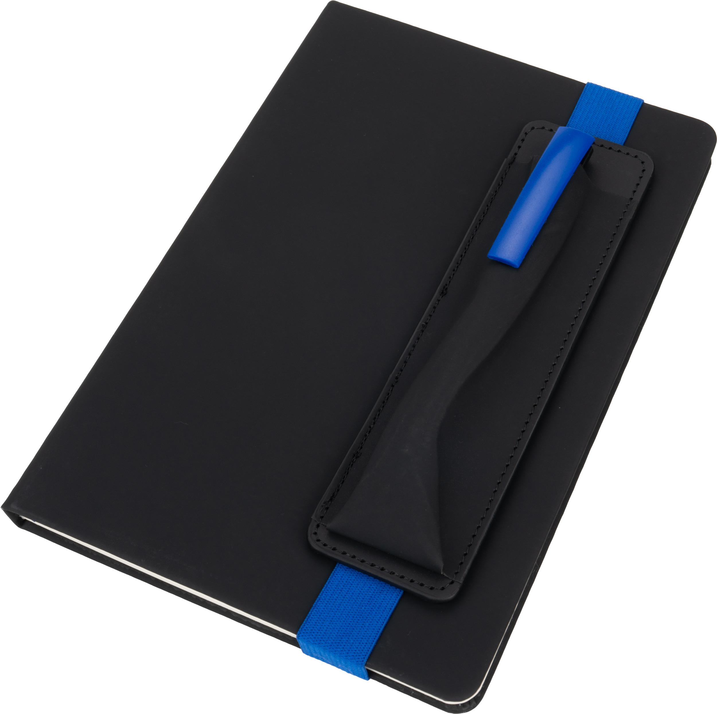 Notatnik A5 z okładką z PU i 192 stronami w linie, zakładką, miejscem na długopis oraz zamknięciem na gumkę.