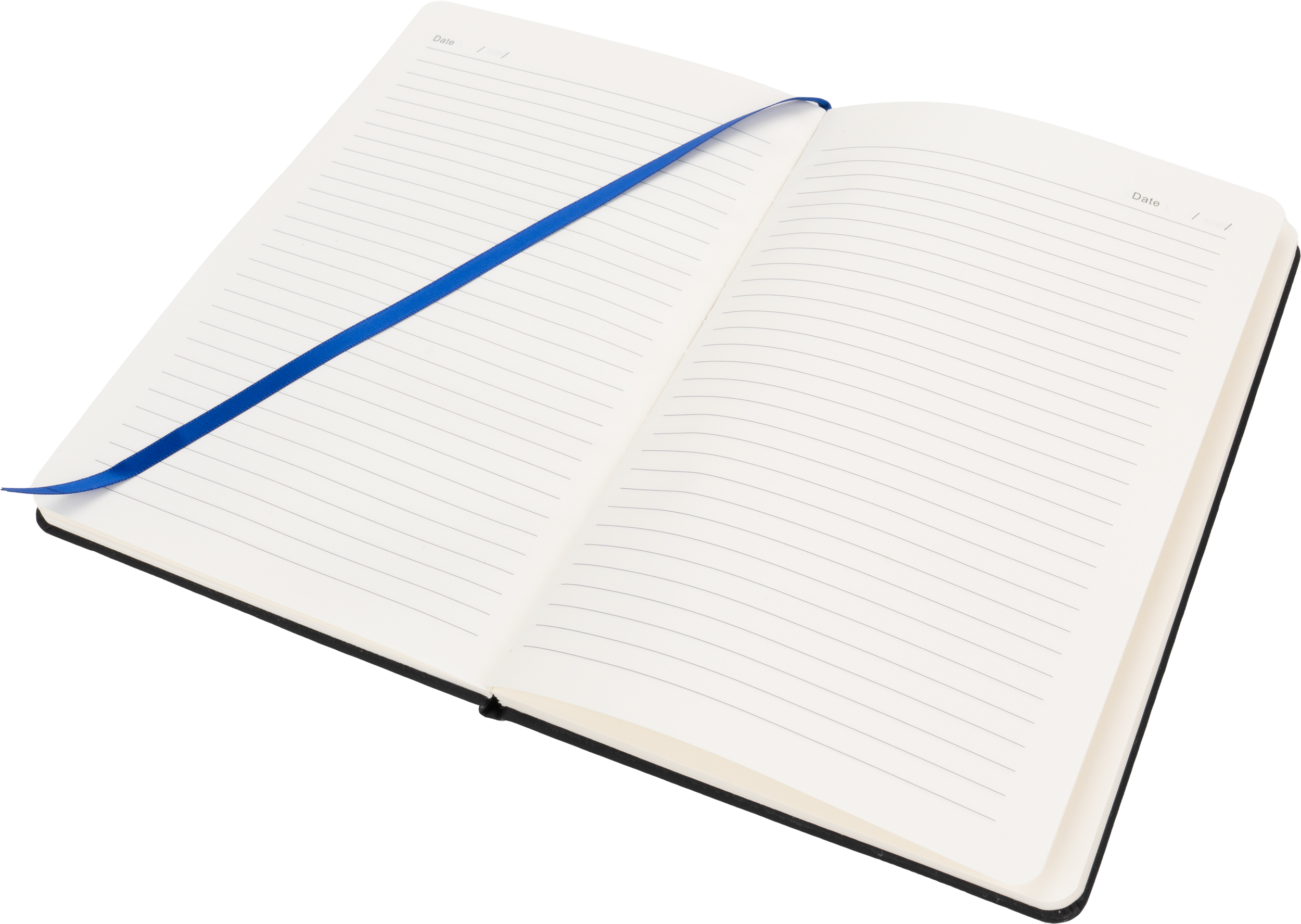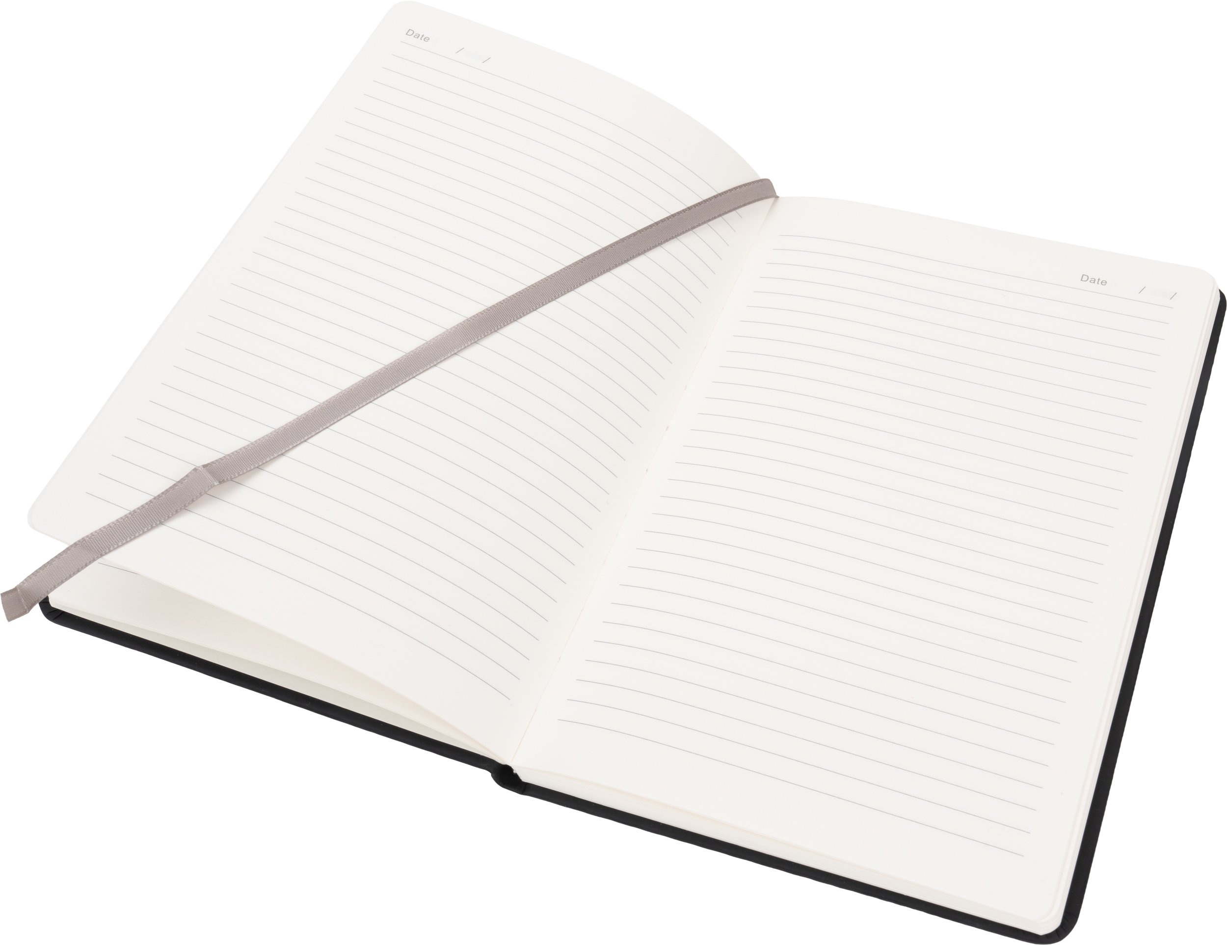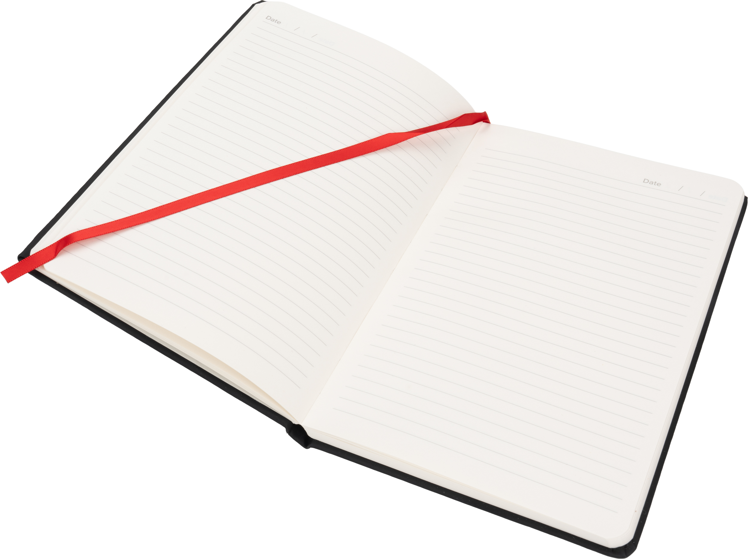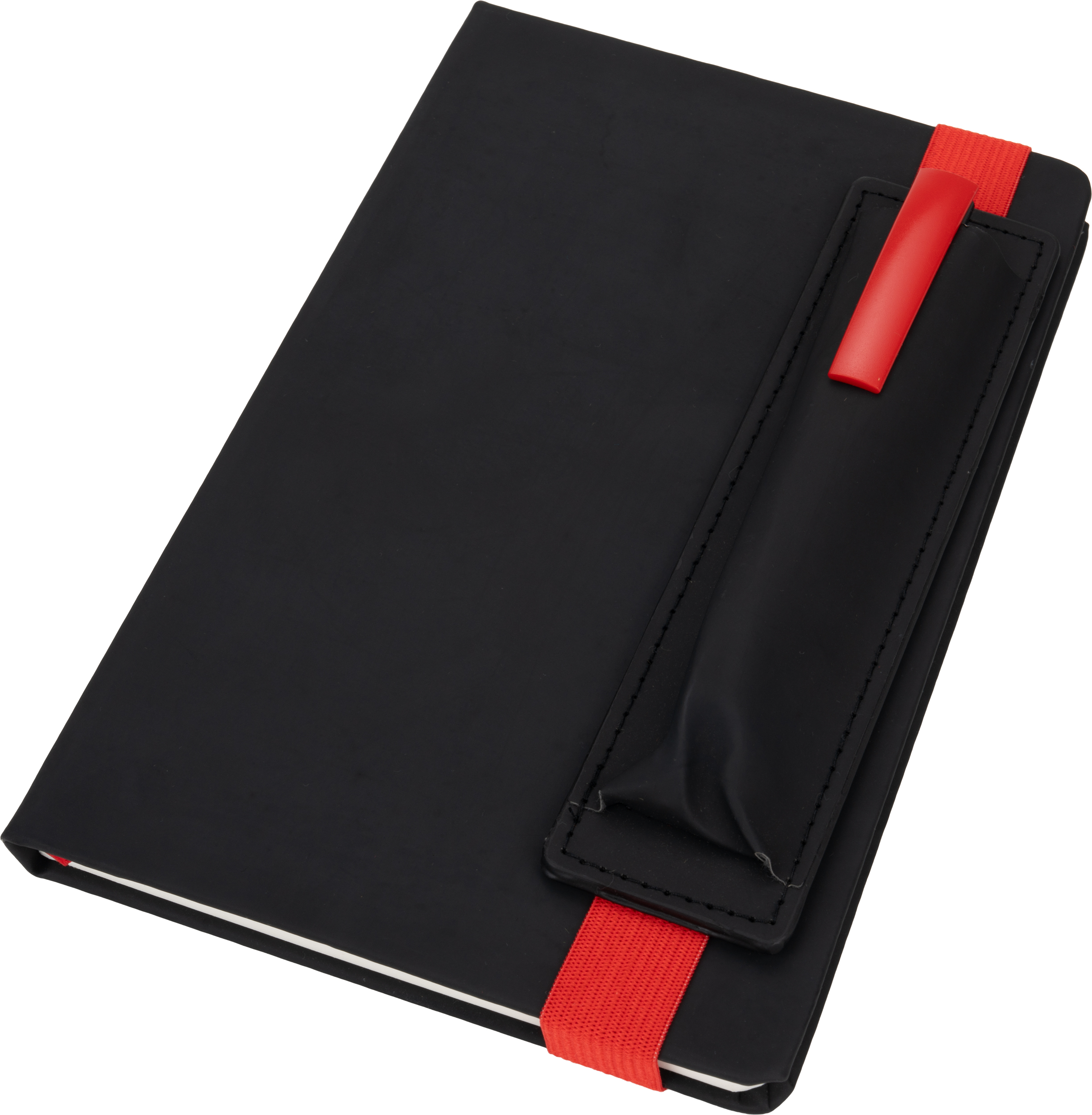 Notatnik A5 z okładką z PU i 192 stronami w linie, zakładką, miejscem na długopis oraz zamknięciem na gumkę.