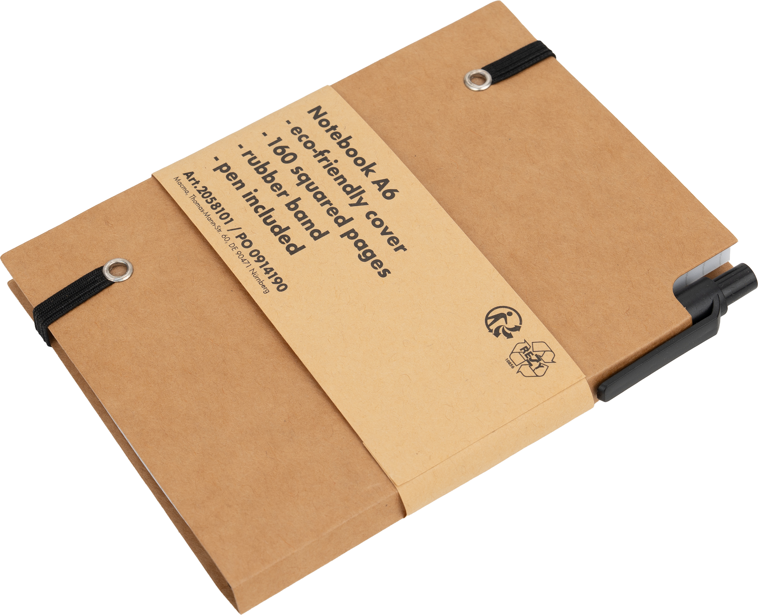 Mały notes (160 stron w kratkę) z ekologiczną okładką z kartonu i gumką do zamykania. W zestawie z długopisem.