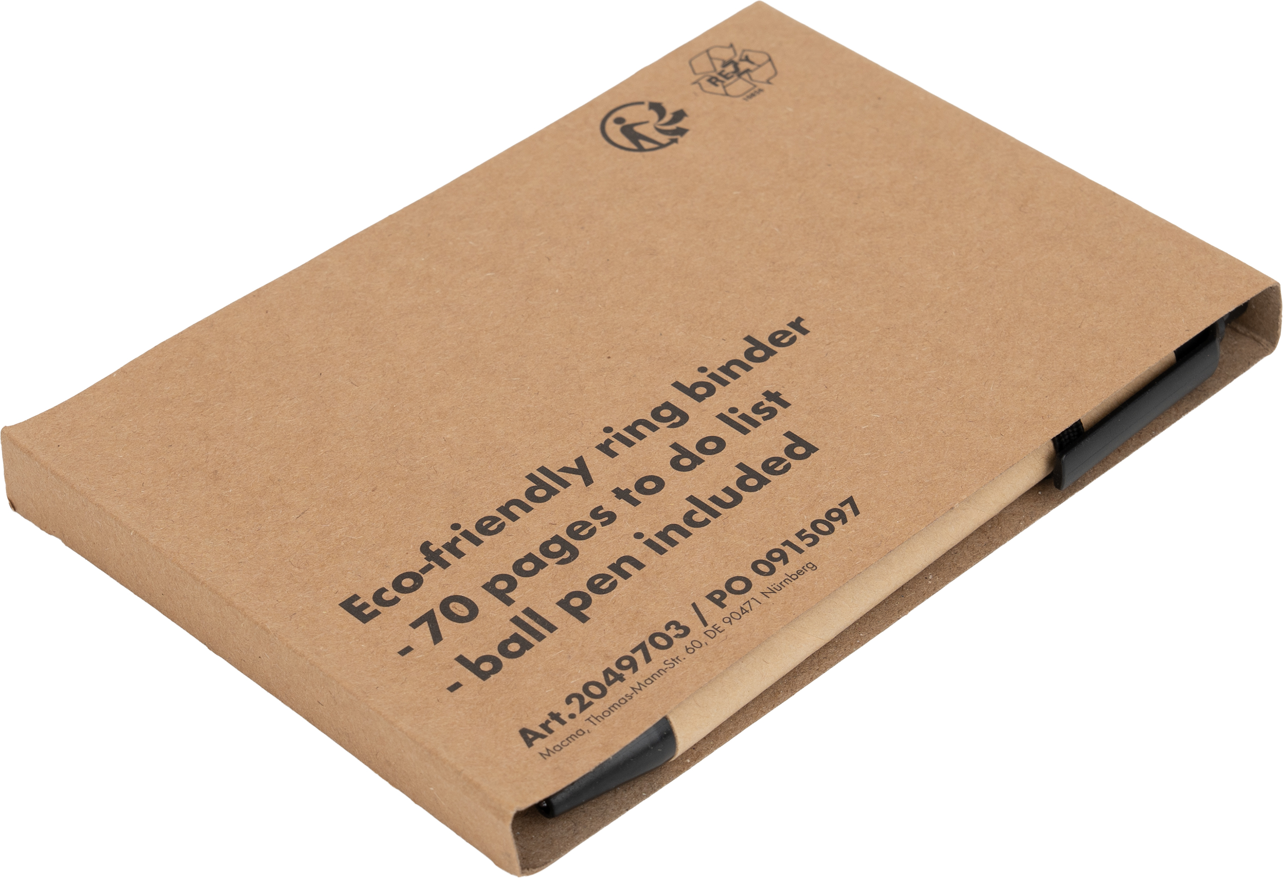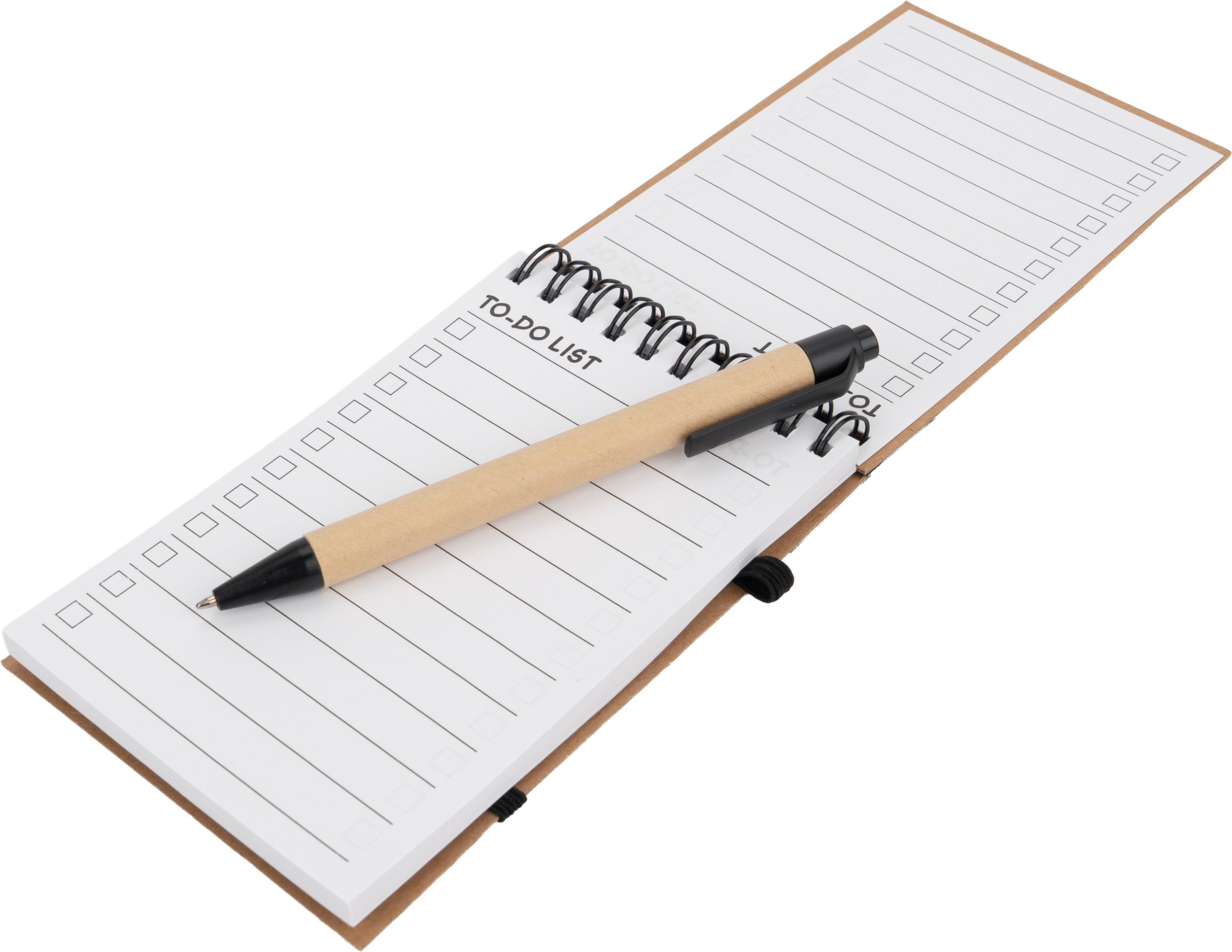Ekologiczny notes (70 stron w linie z listą rzeczy do zrobienia, gramatura papieru 70g/m²) na spirali w komplecie z długopisem.