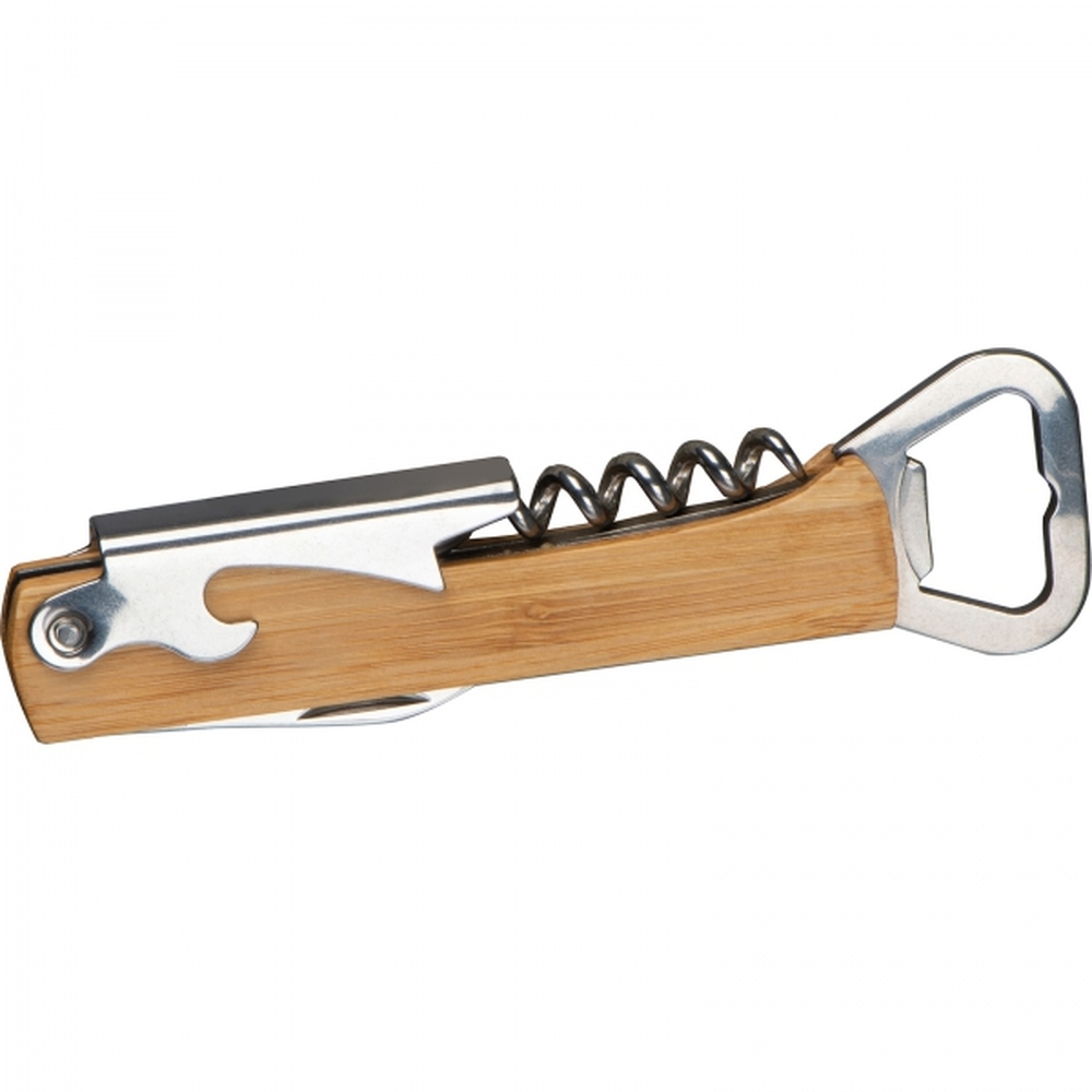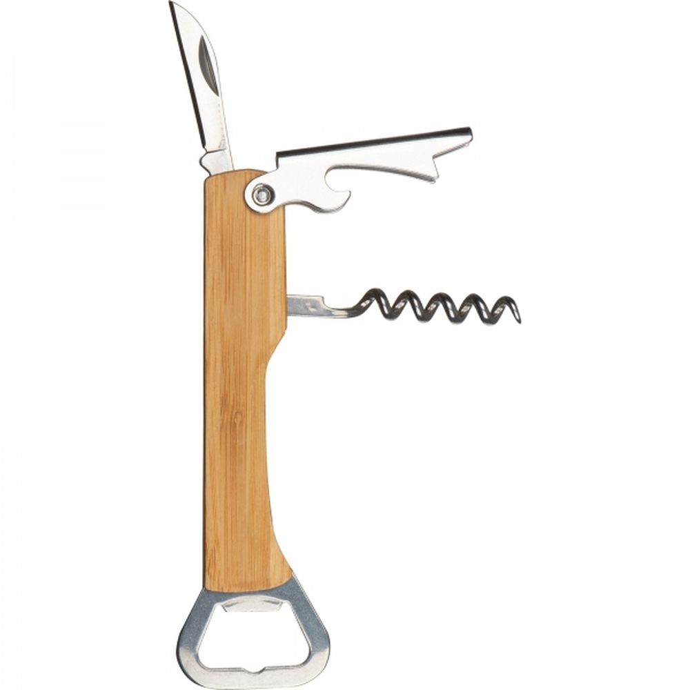 Nóż kelnerski wykonany z metalu i bambusa, wyposażony w otwieracz do butelek, korkociąg i nożyk do folii.