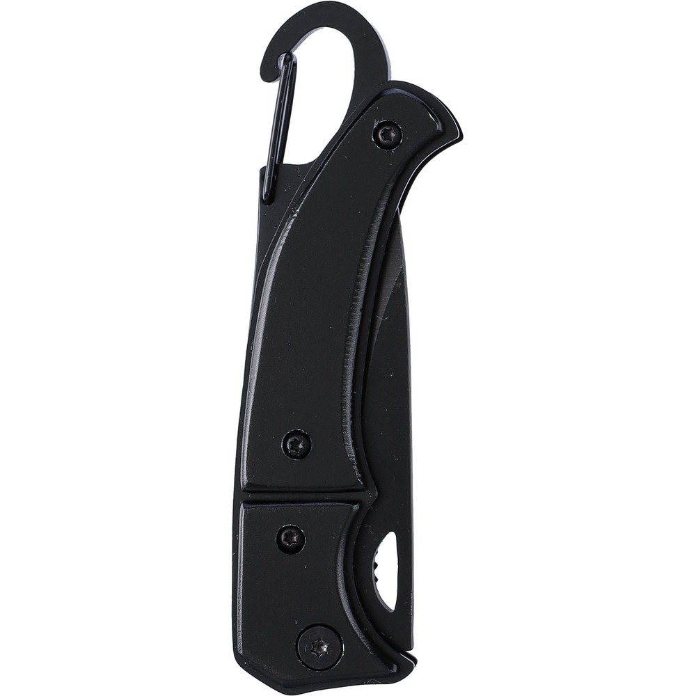 Nóż kieszonkowy z blokadą zabezpieczającą, z karabińczykiem w rękojeści umożliwiającym przypinanie, zapakowany w brązowy kartonik, produkt wykonany ze stali nierdzewnej